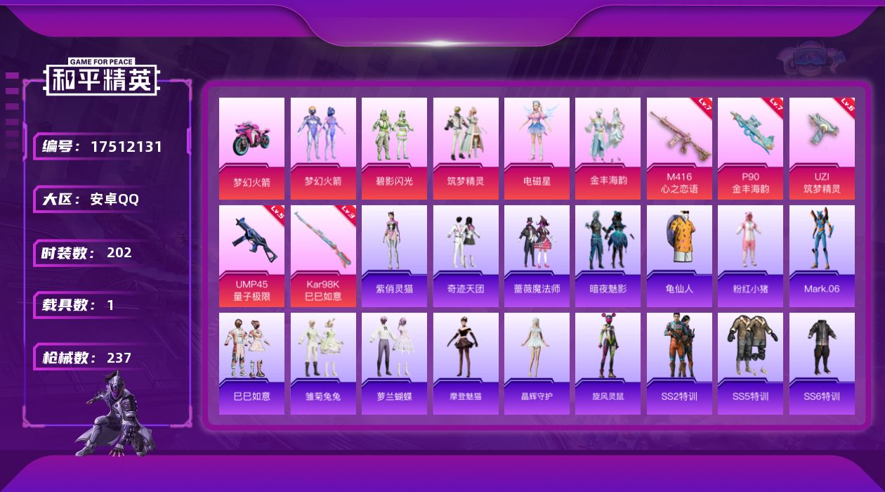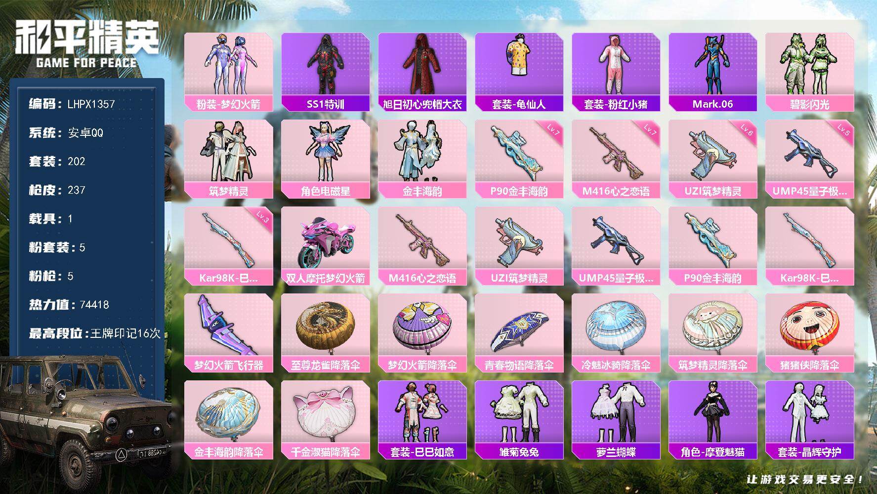 [17512131]可二次【特价出售/店主推荐】安卓 手Q-5粉装-5特效枪-1载具-1粉色飞行器-7.4w热力值-16王牌印记-202套装-237枪皮【热门品类】:粉装-梦幻火箭,套装-SS1特训,旭日初心兜帽大衣,套装-龟仙人,套装-粉红小猪,角色-Mark.06【粉色套装】:粉装-梦幻火箭,粉装-碧影闪光,粉装-筑梦精灵,角色-电磁星,粉装-金丰海韵【粉色枪皮等级】:M416-心之恋语(七级),UZI-筑梦精灵(六级),UMP45-量子极限(五级),P90-金丰海韵(七级),Kar98K-巳巳如意(三级)【粉色载具】:双人摩托-梦幻火箭【粉色飞行器】:梦幻火箭飞行器