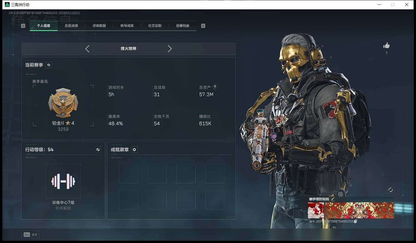 [17512093]57m总资产-1065k哈伏币-54烽火等级-铂金-1战场等级-无军衔