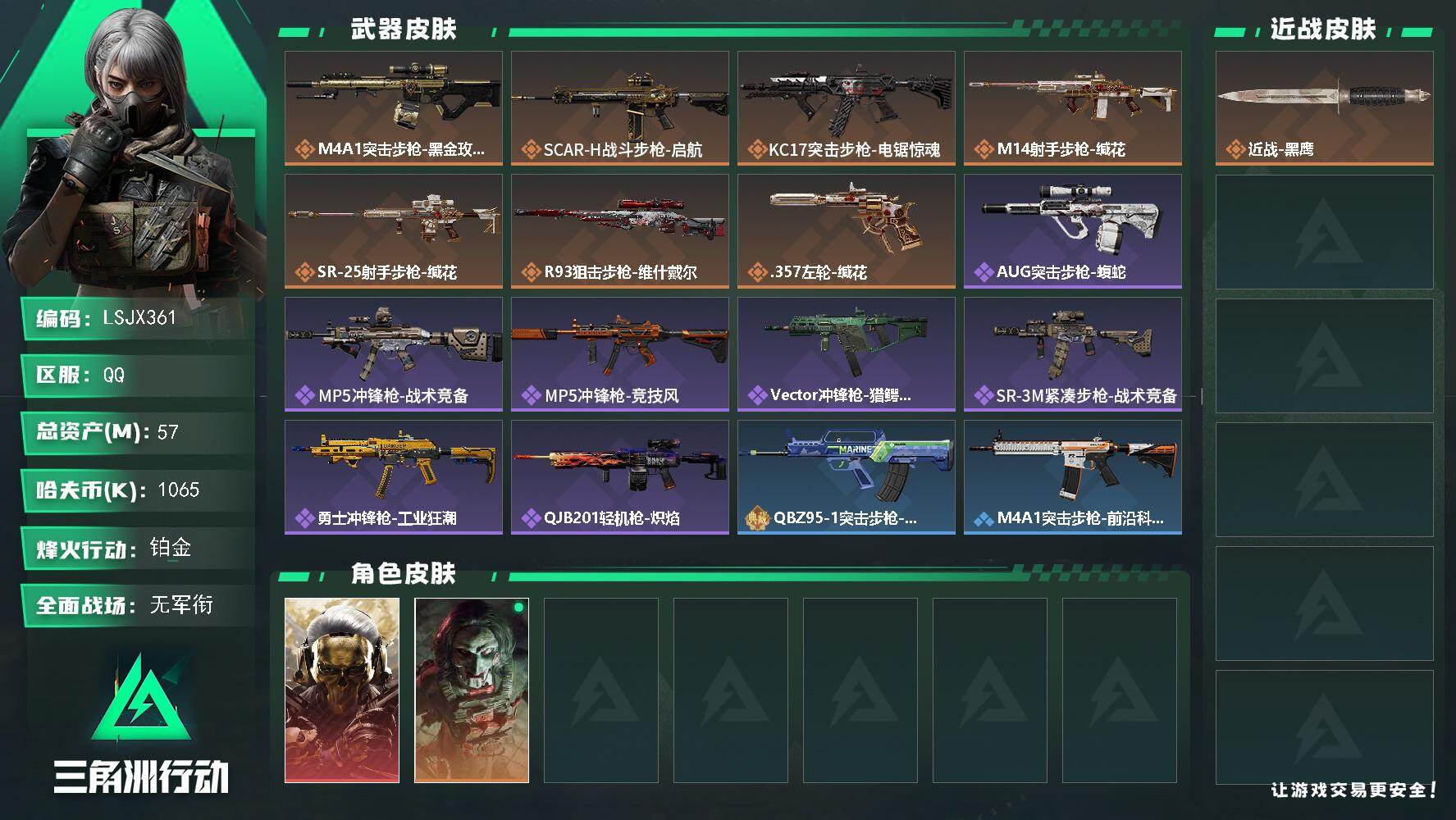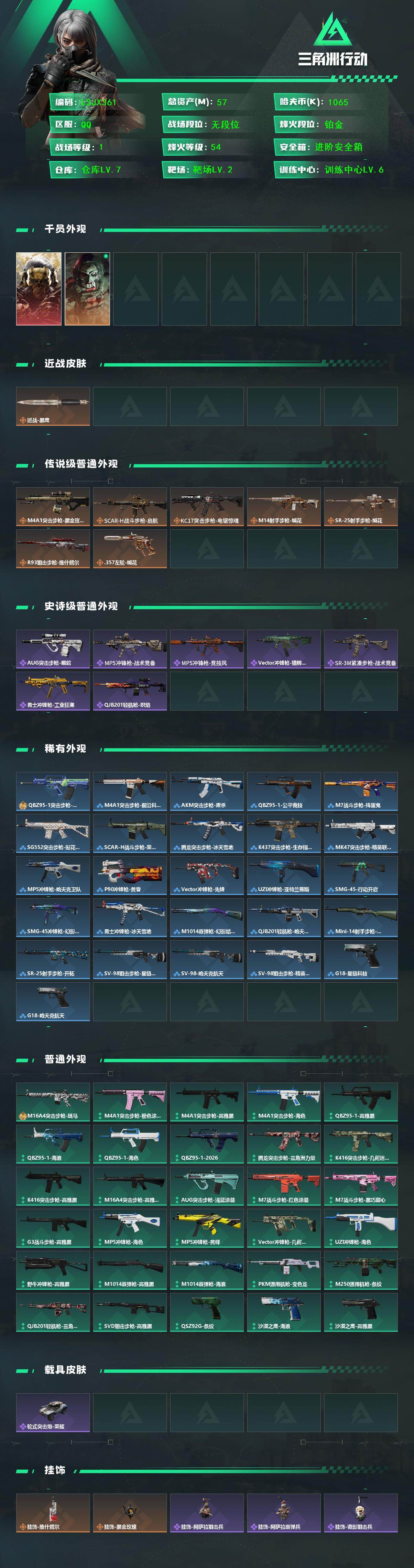 [17512093]57m总资产-1065k哈伏币-54烽火等级-铂金-1战场等级-无军衔 【干员外观】:红狼-蚀金玫瑰,红狼-电锯惊魂 【近战皮肤】:近战-黑鹰 【传说外观】:M4A1突击步枪-蚀金玫瑰,SCAR-H战斗步枪-启航,KC17突击步枪-电锯惊魂,M14射手步枪-缄花,SR-25射手步枪-缄花,R93狙击步枪-维什戴尔,.357左轮-缄花 【史诗外观】:AUG突击步枪-蝮蛇,MP5冲锋枪-战术竞备,MP5冲锋枪-竞技风,Vector冲锋枪-猎鳄行动,SR-3M紧凑突击步枪-战术竞备,勇士冲锋枪-工业狂潮,QJB201轻机枪-炽焰 【稀有外观】:QBZ95-1突击步枪-海岸线,M4A1突击步枪-前沿科技,AKM突击步枪-肃杀,QBZ95-1突击步枪-公平竞技,M7战斗步枪-捣蛋鬼,SG552突击步枪-贴花艺术,SCAR-H战斗步枪-荣耀列队,腾龙突击步枪-冰天雪地,K437突击步枪-生存指令,MK47突击步枪-精英联盟,MP5冲锋枪-哈夫克卫队,P90冲锋枪-黄昏,Vector冲锋枪-先锋,UZI冲锋枪-亚特兰蒂斯,SMG-45冲锋枪-行动开启,SMG-45冲锋枪-幻影结构,勇士冲锋枪-冰天雪地,M1014霰弹枪-幻影结构,QJB201轻机枪-哈夫克卫队,Mini-14射手步枪-荣耀列队,SR-25射手步枪-开拓,SV-98狙击步枪-星链科技,SV-98狙击步枪-哈夫克航天,SV-98狙击步枪-精英联盟,G18-星链科技,G18-哈夫克航天 【普通外观】:M16A4突击步枪-斑马,M4A1突击步枪-粉色涂装,M4A1突击步枪-高雅黑,M4A1突击步枪-海色,QBZ95-1突击步枪-高雅黑,QBZ95-1突击步枪-海浪,QBZ95-1突击步枪-海色,QBZ95-1突击步枪-2026,腾龙突击步枪-三角洲力量,K416突击步枪-几何迷彩,K416突击步枪-高雅黑,M16A4突击步枪-高雅黑,AUG突击步枪-浅蓝涂装,M7战斗步枪-红色涂装,M7战斗步枪-黑巧甜心,G3战斗步枪-高雅黑,MP5冲锋枪-海色,MP5冲锋枪-黄蜂,Vector冲锋枪-几何迷彩,UZI冲锋枪-海色,野牛冲锋枪-高雅黑,M1014霰弹枪-高雅黑,M1014霰弹枪-海浪,PKM通用机枪-变色龙,M250通用机枪-条纹,QJB201轻机枪-三角洲力量,SVD狙击步枪-高雅黑,QSZ92G-条纹,沙漠之鹰-海
