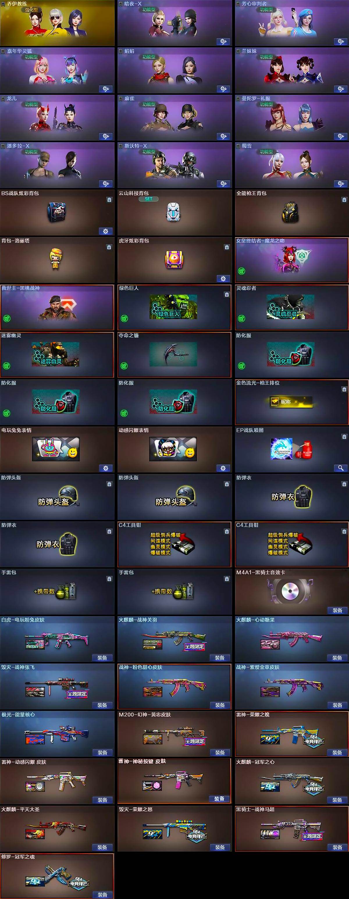 【英雄级武器】:AK47-火麒麟*2,M4A1-雷神,M4A1-黑骑士,无影-神兵利器,烈火-动感闪耀,AK-47-猩红传说,AK47-B-战神*2,白虎-电玩蓝兔,机械迷城-穹宇,Barrett-毁灭,M200-幻神,Barrett-暗月传说,天神-动感闪耀,屠龙,麒麟刺,屠龙-动感闪耀,屠龙-斗烈龙驹,手雷-动感闪耀