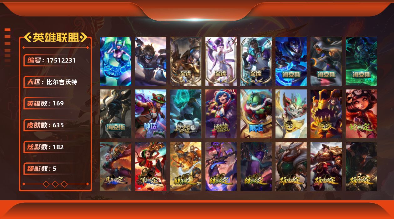 [17512231]未定级段位-169英雄-635皮肤-182炫彩-2终极-11神话-115限定-54传说-157史诗