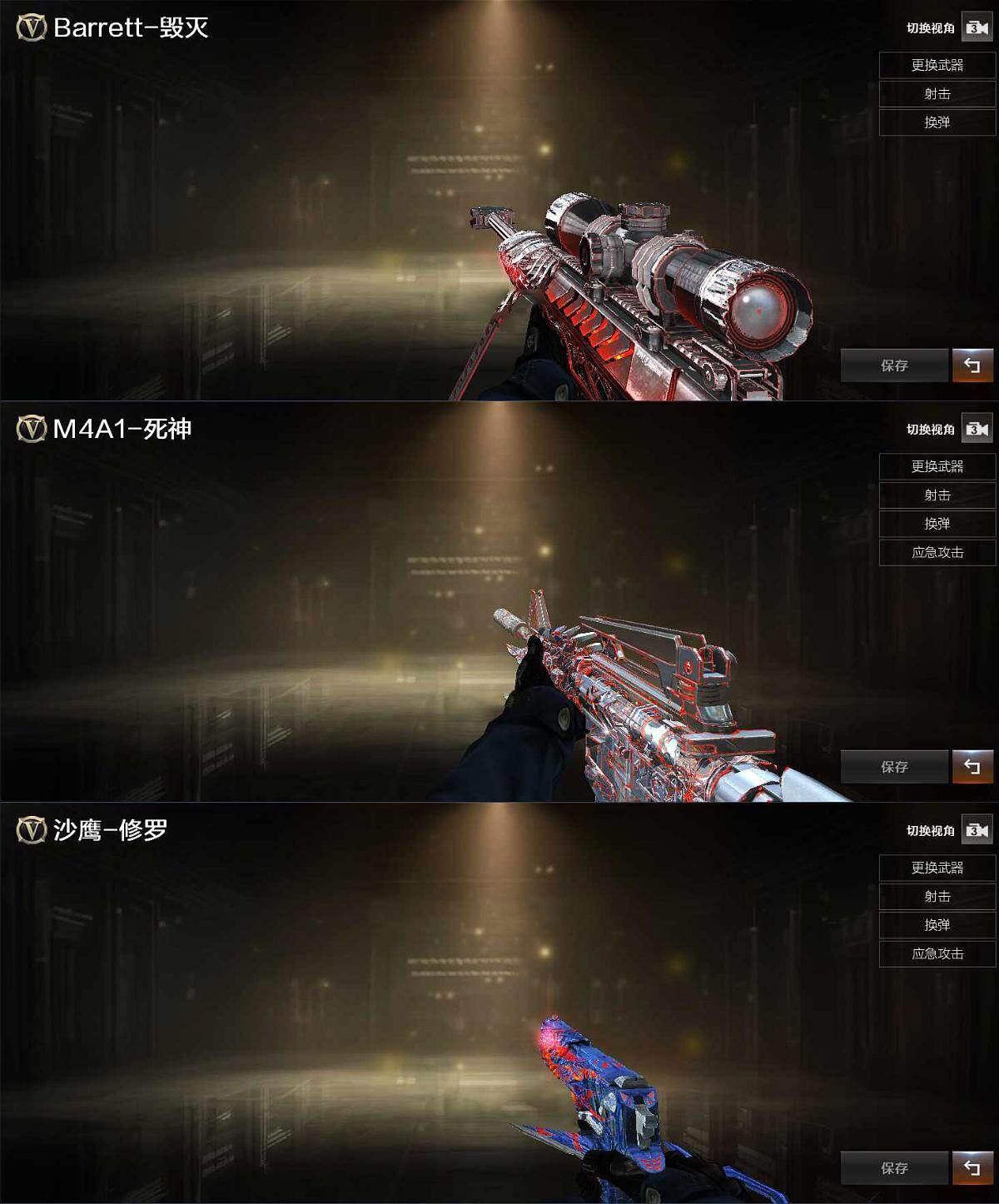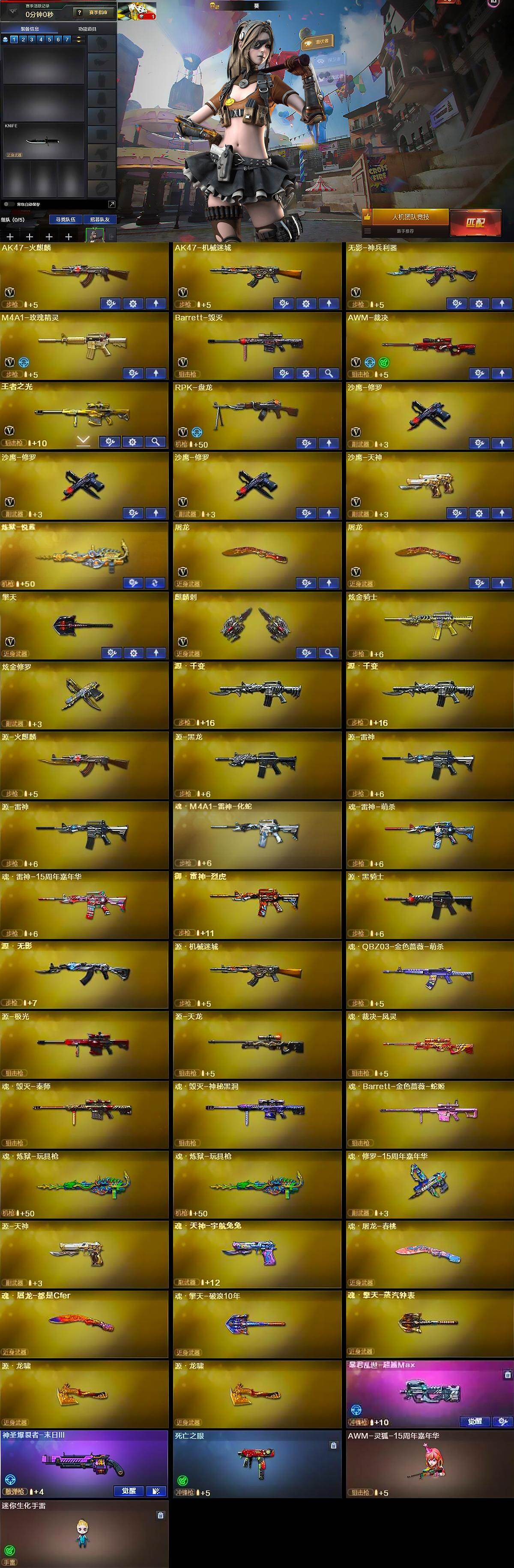 【英雄级武器】:AK47-火麒麟,AK47-机械迷城,无影-神兵利器,M4A1-玫瑰精灵,Barrett-毁灭,AWM-裁决,王者之光-觉醒版,RPK-盘龙,沙鹰-修罗*3,沙鹰-天神,屠龙*2,擎天,麒麟刺