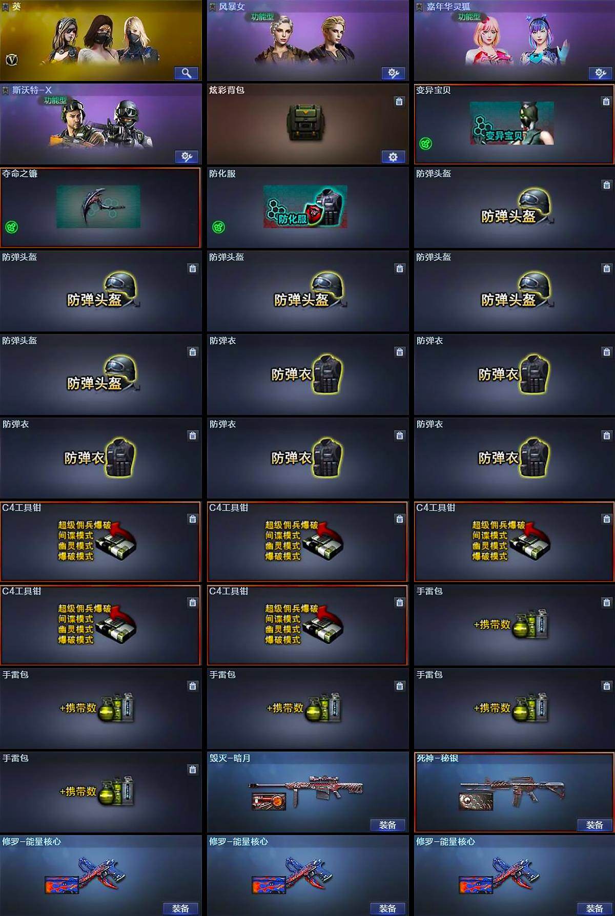 【道具】:炫彩背包,变异宝贝,夺命之镰,防化服,防弹头盔*5,防弹衣*5,C4工具钳*5,手雷包*5