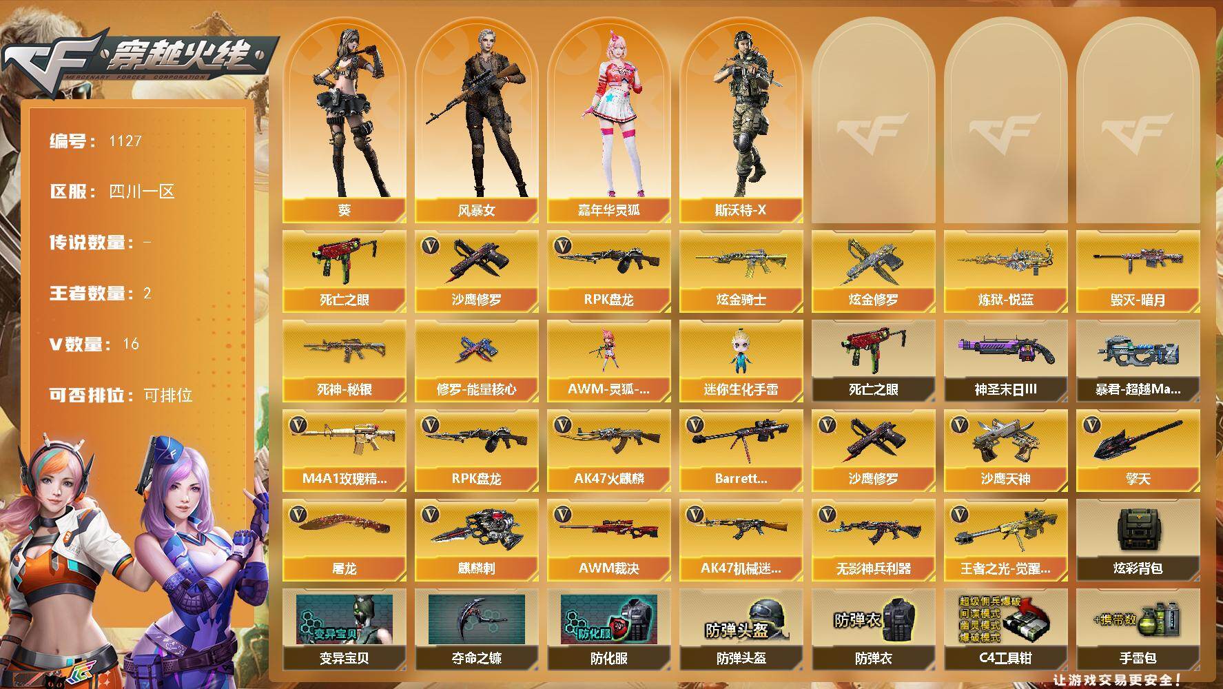 [17513109]四川一区-16V-2王者-2炫金 【热门武器】:死亡之眼,RPK-盘龙,沙鹰-修罗*3 【王者炫金武器】:炼狱-悦蓝,炫金骑士,炫金修罗 【皮肤】:毁灭-暗月,死神-秘银,修罗-能量核心*3 【角色】:葵,风暴女,嘉年华灵狐,斯沃特-X 【人偶武器】:AWM-灵狐-15周年嘉年华,迷你生化手雷 【暴走生化】:死亡之眼 【挑战大师】:暴君乱世-超越Max,神圣爆裂者-末日III 【英雄级武器】:AK47-火麒麟,AK47-机械迷城,无影-神兵利器,M4A1-玫瑰精灵,Barrett-毁灭,AWM-裁决,王者之光-觉醒版,RPK-盘龙,沙鹰-修罗*3,沙鹰-天神,屠龙*2,擎天,麒麟刺 【道具】:炫彩背包,变异宝贝,夺命之镰,防化服,防弹头盔*5,防弹衣*5,C4工具钳*5,手雷包*5 【特殊枪械】:1盘龙