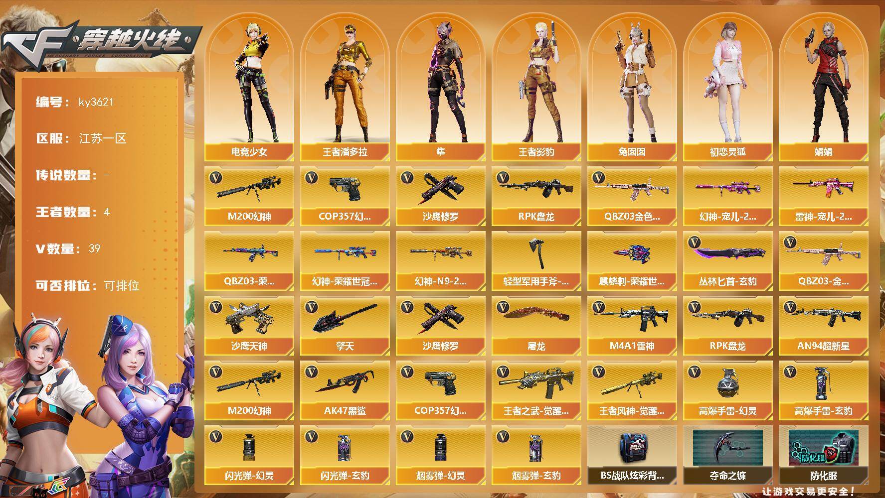 [17513678]【ky3621】江苏一区-39V-4王者-0炫金 【热门武器】:QBZ03-金色蔷薇,M200-幻神,RPK-盘龙,COP 357-幻灵,沙鹰-修罗*3 【皮肤】:幻神-宠儿-2021MVP,M200-幻神-荣耀世冠白鲨,M200-幻神-N9-2022MVP,QBZ03-荣耀世冠白鲨,雷神-宠儿-2019MVP,轻型军用手斧-再燃火线,麒麟刺-荣耀世冠白鲨 【角色】:隼,王者影豹,王者潘多拉,暗夜-X,初恋灵狐,电竞少女,娟娟,潘多拉-X,兔囡囡 【英雄级武器】:M4A1-雷神*2,AN94-超新星,AK47-黑鲨,QBZ03-金色蔷薇,王者之武-觉醒版,M200-幻神,王者风神-觉醒版,RPK-盘龙,沙鹰-修罗*3,沙鹰-天神,COP 357-幻灵,屠龙,擎天,丛林匕首-玄豹,高爆手雷-幻灵*6,高爆手雷-玄豹*2,闪光弹-幻灵*5,闪光弹-玄豹*2,烟雾弹-幻灵*4,烟雾弹-玄豹*2 【道具】:BS战队炫彩背包,夺命之镰,防化服,金色流光-枪王排位,星辰流光-枪王排位,枪王排位28赛季金色流光,EP战队击杀图标,防弹头盔,防弹衣,C4工具钳,手雷包 【特殊枪械】:1盘龙