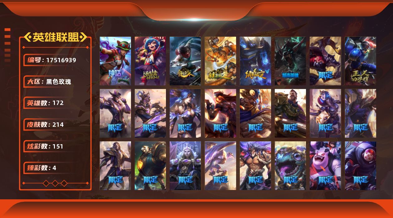 [17516939]【特价出售/店主推荐】铂金段位-172英雄-214皮肤-151炫彩-0终极-2神话-30限定-15传说-55史诗