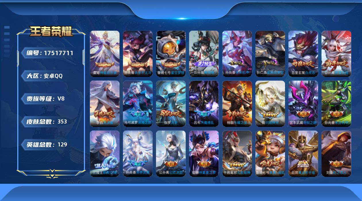 [17517711]安卓Q-114段小国发育路-大国娜可露露大国1.9w战力马可波罗-大国1.9w战力虞姬-小国2.1公孙离-小国1.9狄仁杰-小国2万孙尚香-小国1.9李元芳-小国鲁班七号-小国艾琳-小国戈娅-小国成吉思汗-魔方-V8-129英雄-353皮肤-3典藏皮肤-1典藏英雄-1无双-25传说-102史诗 【英雄全皮】:猪八戒全皮,敖隐全皮,戈娅全皮 【荣耀典藏】:武则天英雄,孙尚香杀手不太冷,鲁班七号星空梦想,虞姬神鉴启示录 【无双皮肤】:公孙离离恨烟 【传说皮肤】:公孙离记忆之芯,马可波罗深海之息,鲁班七号寅虎瑞焰,孙尚香异界灵契,赵云淬星耀世,李元芳飞鸢探春,兰陵王默契交锋,公孙离祈雪灵祝,镜炽阳神光,虞姬启明星使,刘备时之恋人,伽罗太华,干将莫邪久胜战神,虞姬云霓雀翎,百里玄策白虎志,梦奇胖达荣荣,后羿黄金射手座,杨戬永曜之星,貂蝉仲夏夜之梦,李白凤求凰,孙尚香末日机甲,宫本武藏地狱之眼,孙悟空地狱火,吕布天魔缭乱,狄仁杰超时空战士 【限定皮肤】:白起狰,公孙离离恨烟,蒙犽顽岩魄,狄仁杰阴阳师,虞姬凯尔特女王,赵云皇家上将,赵云引擎之心,墨子神迹守卫,嬴政白昼王子,孙尚香蔷薇恋人,孙尚香异界灵契,鲁班七号狮舞东方,鲁班七号寅虎瑞焰,庄周蜃楼王,庄周高山流水,高渐离死亡摇滚,钟无艳王者之锤,钟无艳超时空战士,孙膑妖精王,扁鹊炼金王,白起夜都怪侠,芈月重明,芈月幻夜卜梦,吕布天魔缭乱,吕布猎兽之王,周瑜赤莲之焰,元歌云间偶戏,夏侯惇朔风刀,甄姬游园惊梦,甄姬落雪兰心,曹操烛龙,典韦穷奇,典韦蓝屏警告,马可波罗暗影游猎,马可波罗深海之息,狄仁杰魔术师,狄仁杰万华元夜,达摩星际陆战队,达摩沙漠行僧,项羽海滩派对,老夫子醍醐杖,老夫子航海奇遇记,关羽冰锋战神,程咬金演武夺筹,露娜一生所爱,韩信逐梦之影,王昭君凤凰于飞,王昭君午后时光,兰陵王默契交锋,兰陵王驯魔猎人,兰陵王金庭之子,花木兰青春决赛季,花木兰瑞麟志,亚瑟狮心王,亚瑟潮玩骑士王,孙悟空至尊宝,孙悟空大圣娶亲,牛魔御旌,后羿圣弓游侠,李元芳云中旅人,虞姬霸王别姬,虞姬启明星使,钟馗神迹守卫,钟馗驱傩正仪,杨玉环遇见飞天,杨戬永曜之星,女娲朔望之晖,干将莫邪冰霜恋舞曲,干将莫邪真爱魔法,雅典娜单词大作战,雅典娜黎明之约,蔡文姬繁星吟游,太乙真人饕餮,太乙真人华丽摇滚,鬼谷子原初探秘者,鬼谷子五谷丰年,黄忠火炮绅士,苏烈千