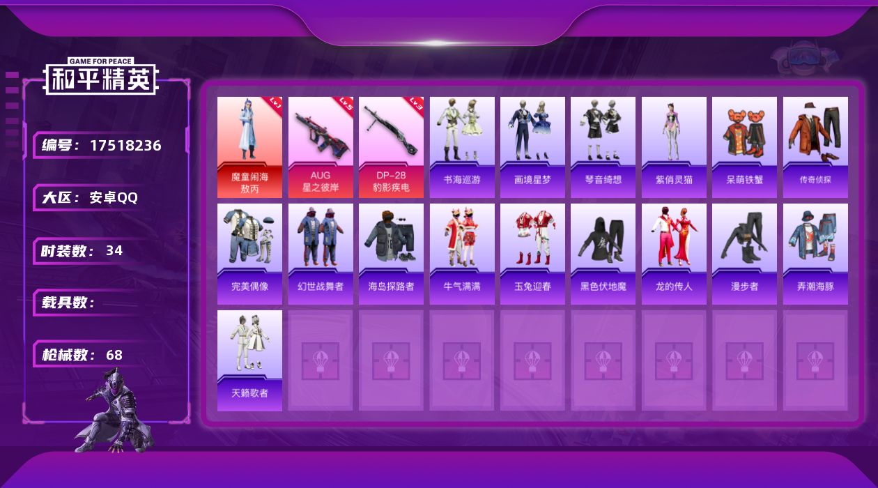 [17518236]安卓 手Q-1神装-0粉装-5特效枪-0载具-1粉色飞行器-17950热力值-1王牌印记-34套装-68枪皮