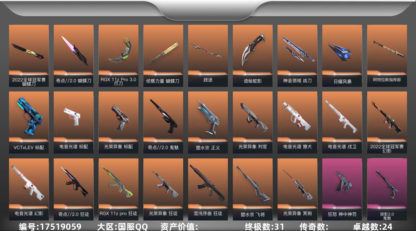 [17519059]【153】【套装】:2022全球冠军赛套装,光荣异象套装,电音光谱套装,奇点//2.0套装,掠影//2.0套装,神中神罚套装,掠影套装 【英雄】:幻棱,炼狱,维斯,暮蝶,钛狐,壹决,铁臂,捷风,雷兹,幽影,不死鸟,贤者,猎枭,蝰蛇,零,芮娜,奇乐,尚勃勒,霓虹,夜露,星礈,K/O,海神,盖可,黑梦,钢锁 【近战武器】:近战武器-2022全球冠军赛 蝴蝶刀,近战武器-影钩,近战武器-光荣异象 歧途,近战武器-谐波音谱,近战武器-神之刃,近战武器-侦察力量 蝴蝶刀,近战武器-奇点//2.0 蝴蝶刀,近战武器-紫金爪刀,近战武器-RGX 11z Pro//3.0 爪刀,近战武器-夜刃诡镰,近战武器-影刃,近战武器-诡秘蛇影 军刀,近战武器-神圣领域 战刀,近战武器-日耀风暴 遗器,近战武器-阿特拉斯指挥部 甩棍 【狂徒】:狂徒-混沌序曲,狂徒-奇点//2.0,狂徒-RGX 11z Pro,狂徒-光荣异象,狂徒-掠影,狂徒-盖亚的复仇,狂徒-离子武器//2.0,狂徒-诡秘蛇影 【幻影】:幻影-2022全球冠军赛,幻影-电音光谱,幻影-天界神兵//2.0,幻影-侦察力量,幻影-神中神罚,幻影-掠影//2.0,幻影-神圣领域,幻影-末日之翼,幻影-电音光谱 【戍卫】:戍卫-电音光谱,戍卫-掠影,戍卫-天界神兵,戍卫-浮光跃金,戍卫-月球哨兵,戍卫-折光棱晶,戍卫-电音光谱 【獠犬】:獠犬-电音光谱,獠犬-神圣领域,獠犬-模拟赫兹,獠犬-电音光谱 【冥驹】:冥驹-光荣异象,冥驹-掠影,冥驹-离子武器,冥驹-模拟赫兹,冥驹-星云暗涌 【飞将】:飞将-塑水宗,飞将-末日之翼 【莽侠】:莽侠-神中神罚,莽侠-超限闪存,莽侠-诡秘蛇影,莽侠-月球哨兵 【战神】:战神-奇幻朋克//2.0,战神-神圣领域,战神-浮光跃金 【奥丁】:奥丁-掠影//2.0,奥丁-末日之翼 【判官】:判官-光荣异象,判官-诡秘蛇影 【雄鹿】:雄鹿-起源,雄鹿-紫阙金琅//2.0,雄鹿-模拟赫兹,雄鹿-月球哨兵 【骇灵】:骇灵-神中神罚,骇灵-掠影//2.0,骇灵-浮光跃金,骇灵-星云暗涌 【蜂刺】:蜂刺-超限闪存,蜂刺-星云暗涌,蜂刺-折光棱晶 【标配】:标配-电音光谱,标配-光荣异象,标配-浮光跃金,标配-折光棱晶,标配-电音光谱 【VCT手枪】:标配-VCT x LEV 【正义】:正义-塑水宗,正义-掠影,