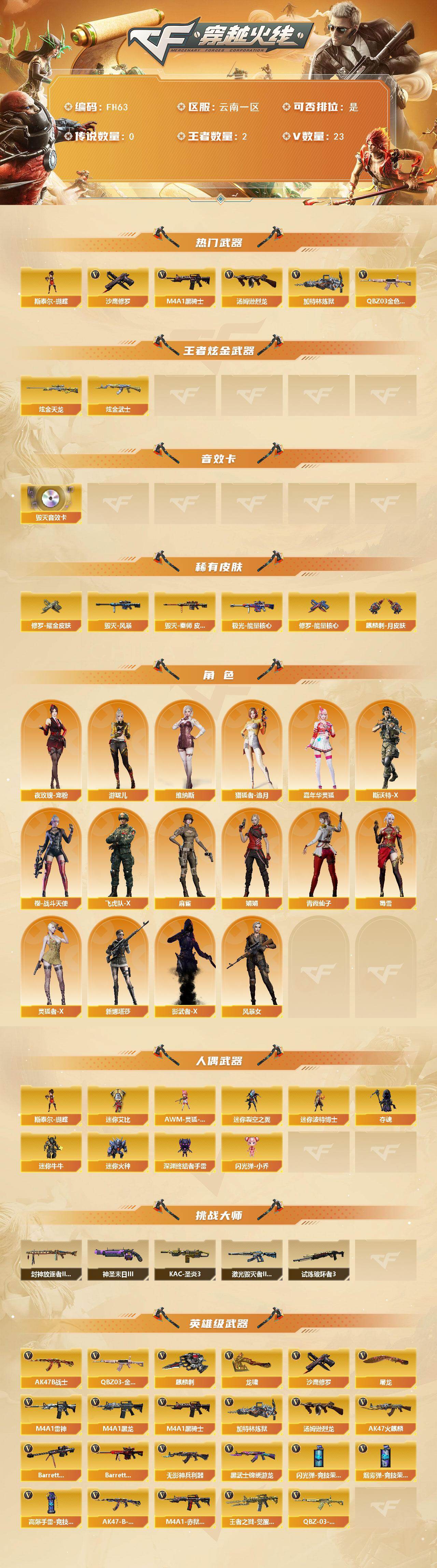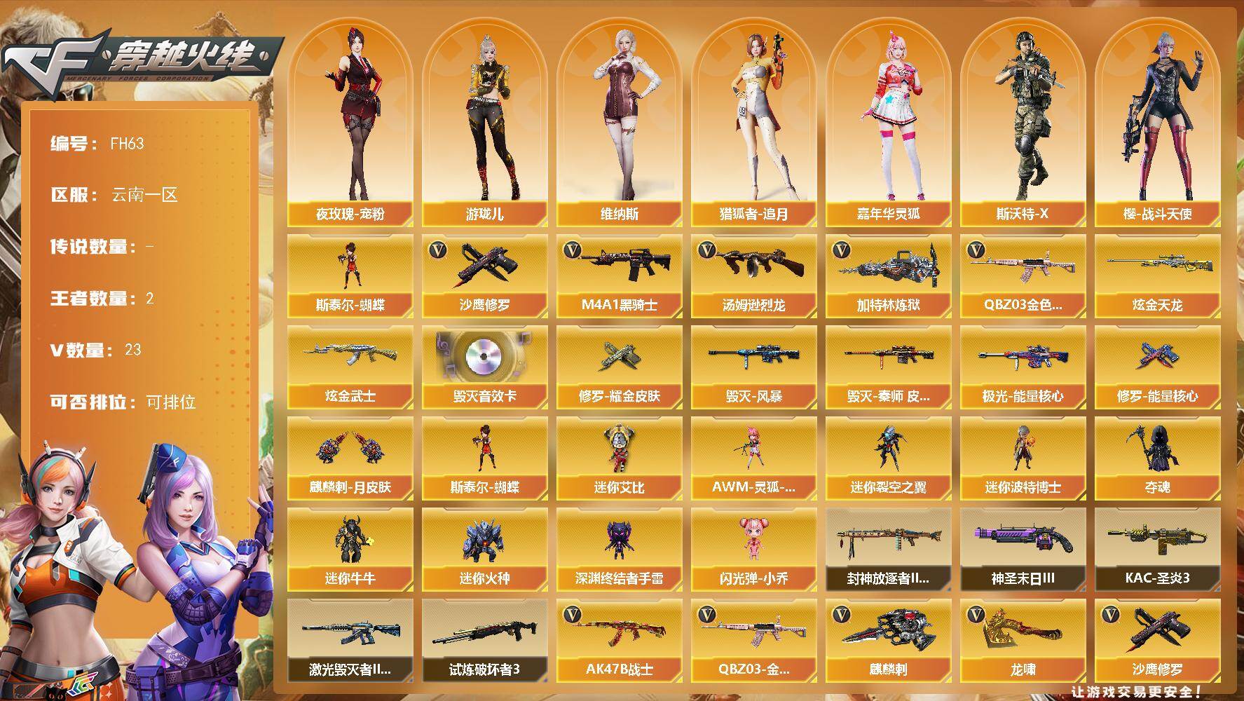 [17519125]云南一区-25V-2王者武器数-2炫金武器数 【热门武器】:QBZ03-金色蔷薇,M4A1-黑骑士,汤姆逊-烈龙*2,加特林-炼狱,斯泰尔-蝴蝶,沙鹰-修罗 【王者炫金武器】:炫金武士,炫金天龙 【音效卡】:Barrett-毁灭音效卡 【皮肤】:毁灭-风暴,毁灭-秦师 皮肤,极光-能量核心,修罗-能量核心,修罗耀金皮肤,麒麟刺-月皮肤 【角色】:飞虎队-X,风暴女*2,嘉年华灵狐,娟娟,猎狐者-追月,灵狐者-X,麻雀,青霞仙子,斯沃特-X,蜀雪,维纳斯,新娜塔莎,夜玫瑰-宠粉,樱-战斗天使,影武者-X,游珑儿 【人偶武器】:斯泰尔-蝴蝶,AWM-灵狐-15周年嘉年华,迷你裂空之翼*3,迷你波特博士,夺魂*4,迷你牛牛,迷你火种*4,深渊终结者手雷,闪光弹-小乔,迷你艾比 【挑战大师】:激光毁灭者III-白马银枪,试炼破坏者III,KAC-圣炎切割者III,神圣爆裂者-末日III,封神放逐者III 【英雄级武器】:AK47-火麒麟,M4A1-黑龙,M4A1-雷神,M4A1-黑骑士,无影-神兵利器,黑武士-锦绣游龙,QBZ03-金色蔷薇,王者之戮-觉醒版,AK47-B-战神,QBZ-03-王者蔷薇-觉醒版,AK47-B-战士,Barrett-毁灭,Barrett-极光,加特林-炼狱,汤姆逊-烈龙*2,沙鹰-修罗,屠龙*2,龙啸,麒麟刺,高爆手雷-竞技荣光,闪光弹-竞技荣光,烟雾弹-竞技荣光,M4A1-赤狱骑士 【源级武器】:源-千变,魂·火麒麟-百城,源-黑龙,魂·雷神-新春神龙,魂-雷神-萌杀,魂·雷神-15周年嘉年华,魂·雷神-萌柴,御·雷神-机甲刑天,御·雷神-烈虎,雷神-赛博朋克,御·雷神-小白龙*2,源·黑骑士,魂·黑骑士-摸金校尉*2,魂·黑骑士-幻能朋克,魂·黑骑士-娜塔莉娅,御·黑骑士-冰魄,魂-死神-机甲核心*2,源·超新星,源·武圣,源·青龙,灵·HK417-朱雀-甜蜜火力,魂·9A91·烈火-电子连击,源·猎神*2,魂·裁决-凤灵,魂·裁决-新人王绿豆,魂·毁灭-秦师,魂·毁灭-青帝*2,魂·毁灭-神秘黑洞,魂·Barrett-朱雀- 新春神龙,源·Barrett-朱雀*2,魂·炼狱-月,御·炼狱-女娲,魂·修罗-15周年嘉年华,魂·修罗-现代金属,源·天神*3,魂·天神-阿努比斯,魂·天神-维纳斯,魂·天神-宇航兔兔,源·龙啸*2,魂·龙啸-秦