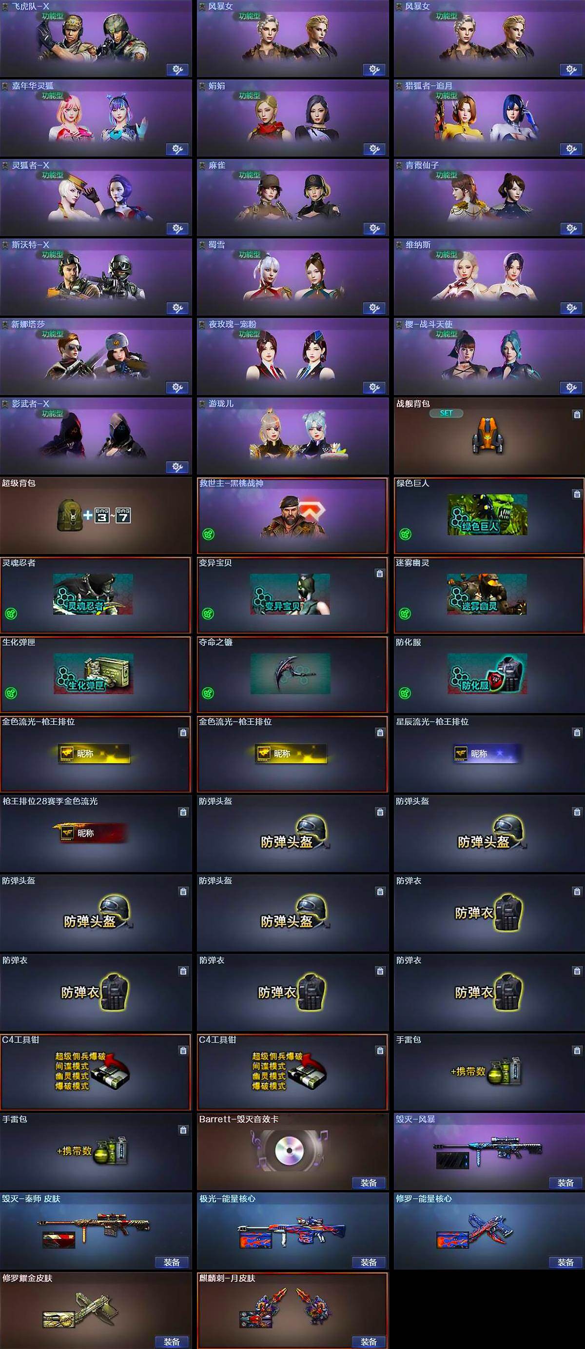 【英雄级武器】:AK47-火麒麟,M4A1-黑龙,M4A1-雷神,M4A1-黑骑士,无影-神兵利器,黑武士-锦绣游龙,QBZ03-金色蔷薇,王者之戮-觉醒版,AK47-B-战神,QBZ-03-王者蔷薇-觉醒版,AK47-B-战士,Barrett-毁灭,Barrett-极光,加特林-炼狱,汤姆逊-烈龙*2,沙鹰-修罗,屠龙*2,龙啸,麒麟刺,高爆手雷-竞技荣光,闪光弹-竞技荣光,烟雾弹-竞技荣光,M4A1-赤狱骑士