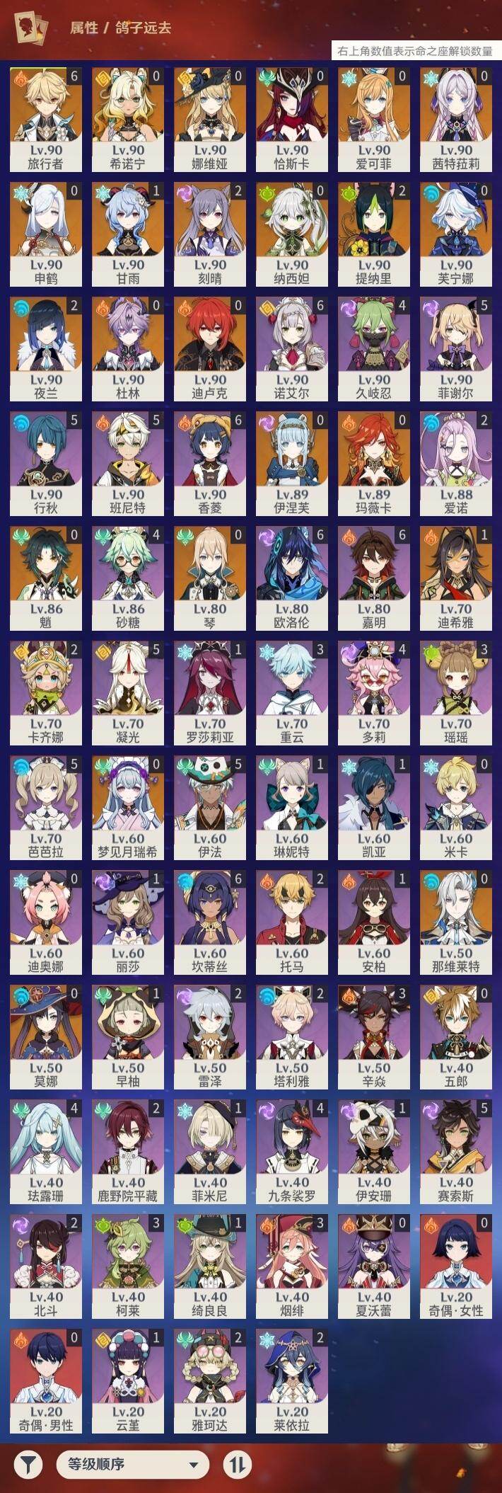 - [14744602]56级/18黄/女主/13个五星角色/3个五星武器 0命流浪者,0命纳西妲,1命赛诺,1命提纳里,0命八重神子,0命枫原万叶,0命魈,0命宵宫,0命可莉,0命珊瑚宫心海,0命七七,0命琴,0命莫娜,精1图莱杜拉的回忆,精1护摩之杖,精1天空之卷