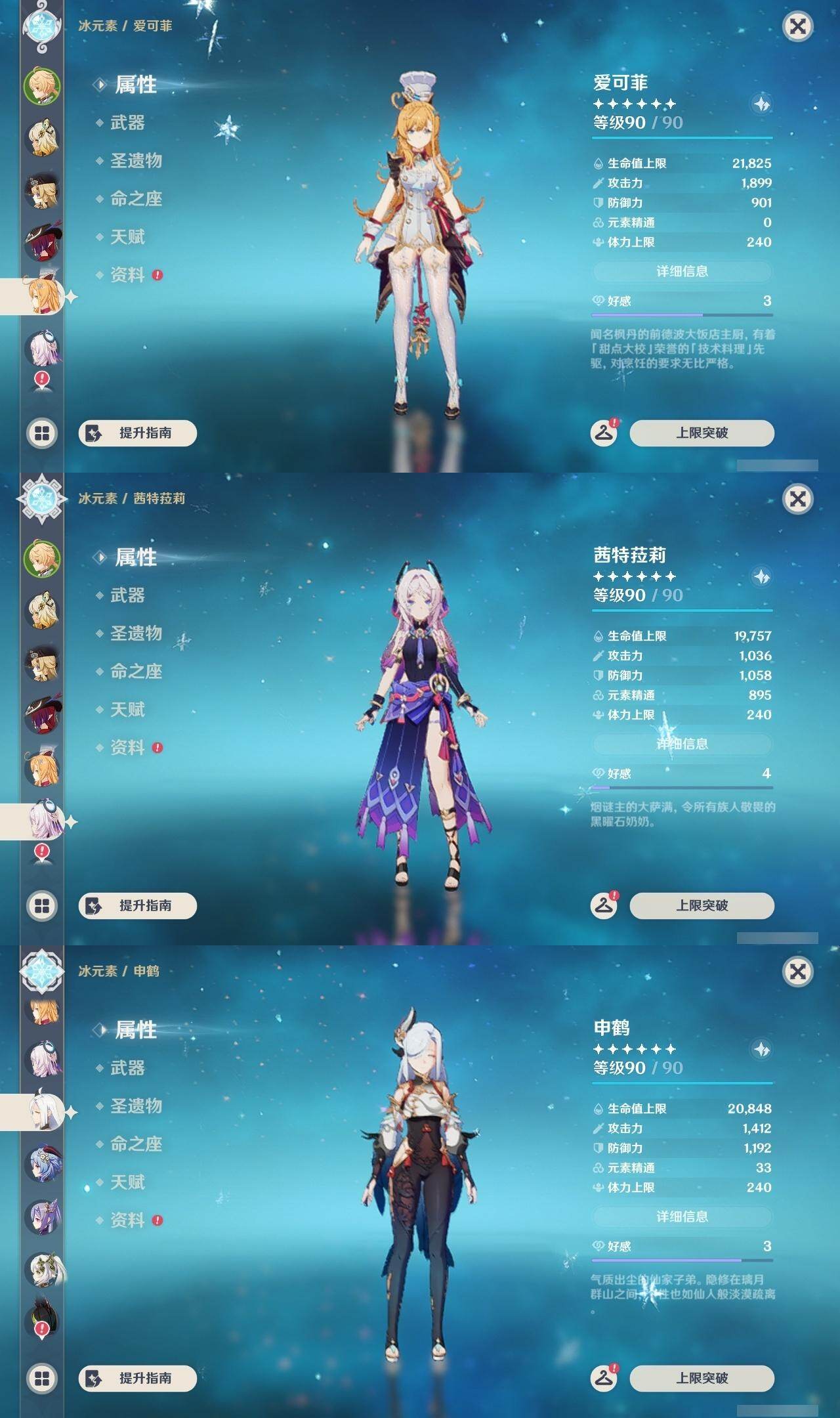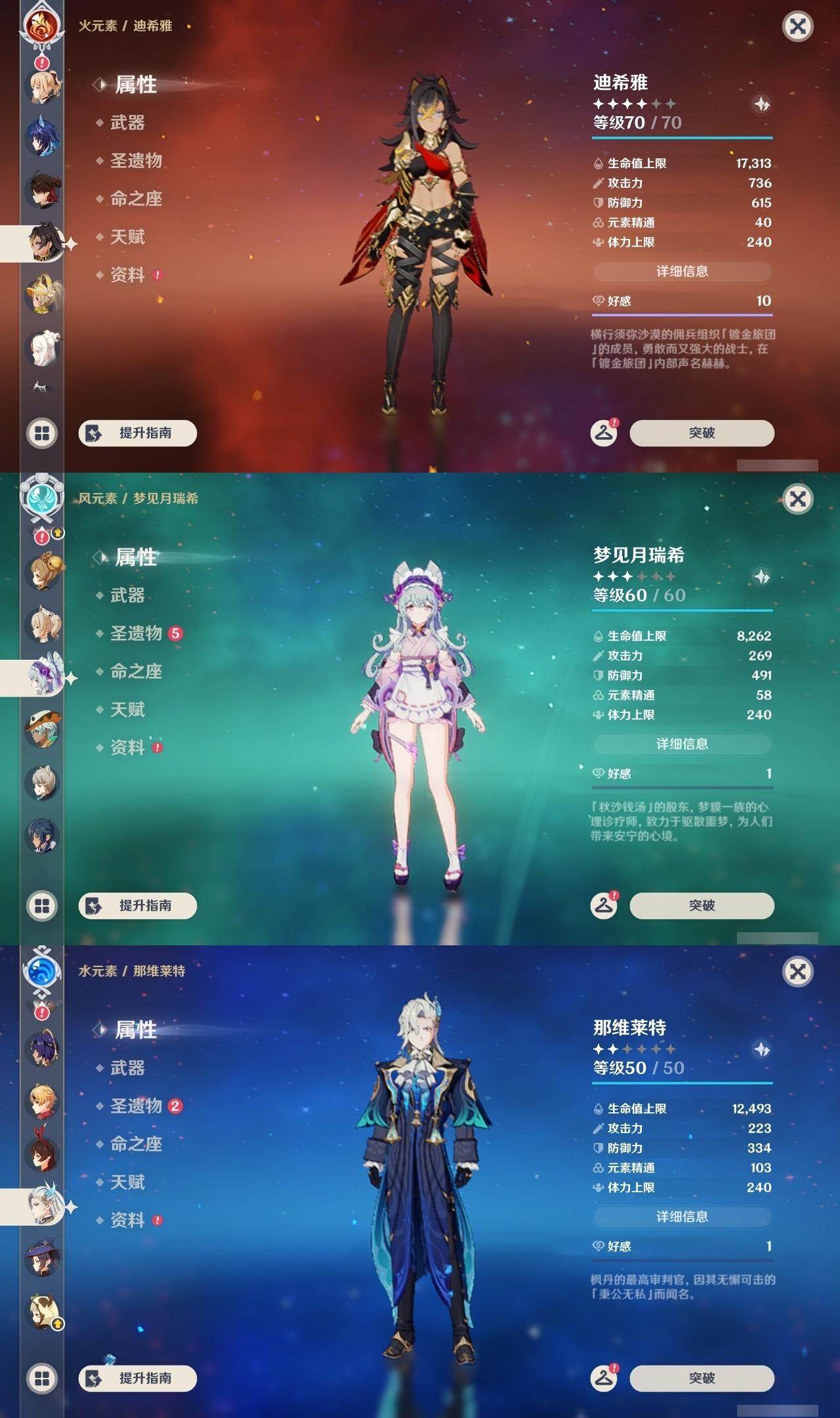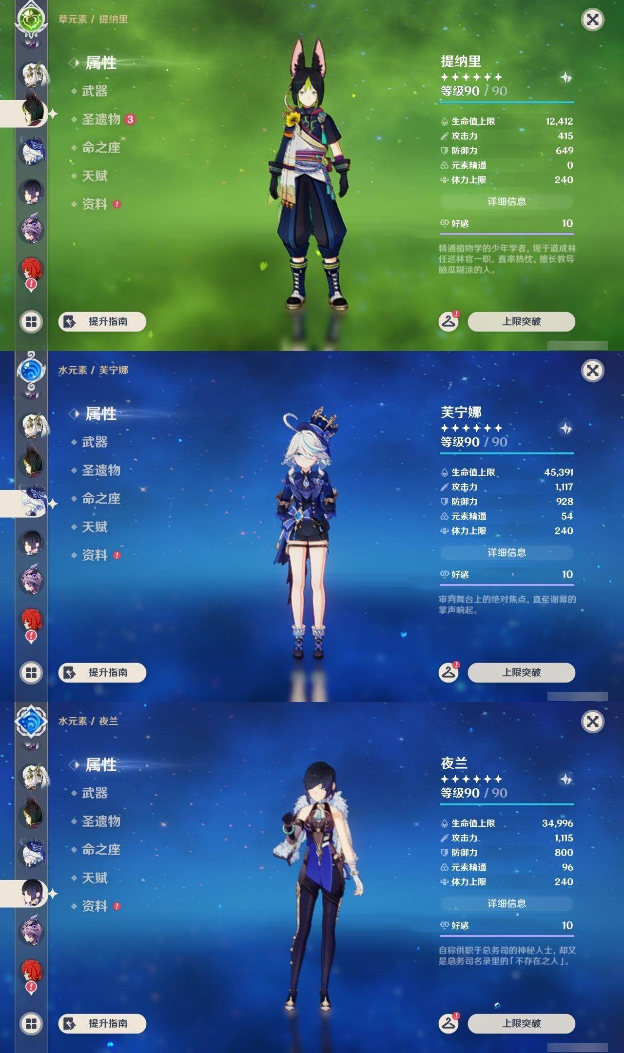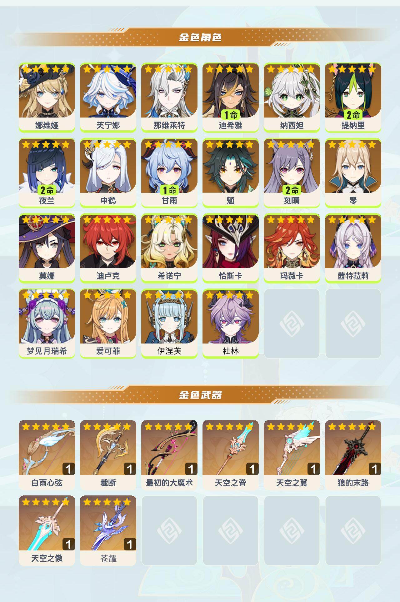 0命娜维娅,0命芙宁娜,0命那维莱特,1命迪希雅,0命纳西妲,2命提纳里,2命夜兰,0命申鹤,1命甘雨,0命魈,2命刻晴,0命琴,0命莫娜,0命迪卢克,0命希诺宁,0命恰斯卡,0命玛薇卡,0命茜特菈莉,0命梦见月瑞希,0命爱可菲,0命伊涅芙,0命杜林,精1白雨心弦,精1裁断,精1最初的大魔术,精1天空之脊,精1天空之翼,精1狼的末路,精1天空之傲,精1苍耀