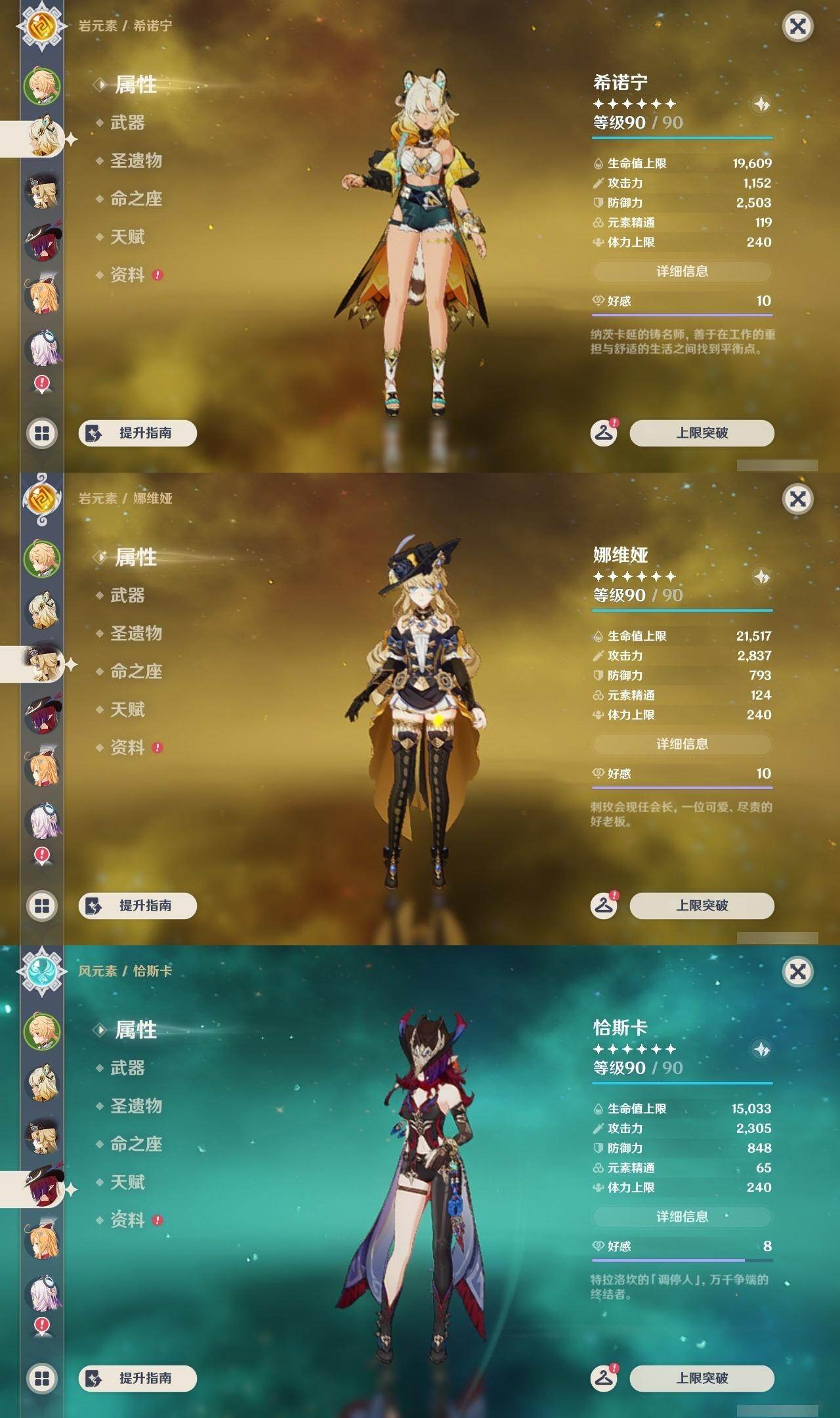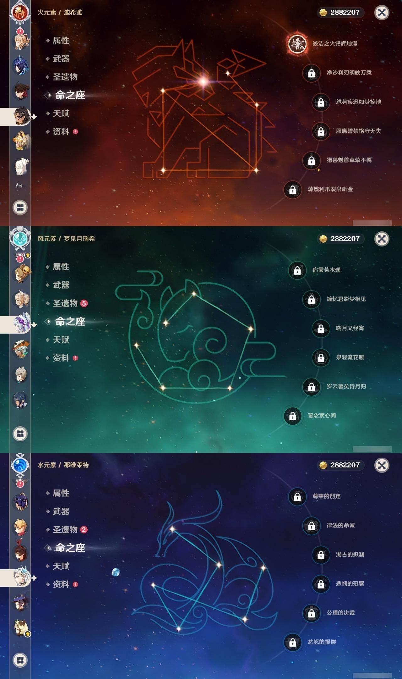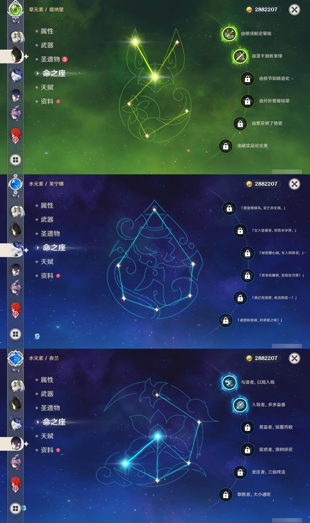 0命娜维娅,0命芙宁娜,0命那维莱特,1命迪希雅,0命纳西妲,2命提纳里,2命夜兰,0命申鹤,1命甘雨,0命魈,2命刻晴,0命琴,0命莫娜,0命迪卢克,0命希诺宁,0命恰斯卡,0命玛薇卡,0命茜特菈莉,0命梦见月瑞希,0命爱可菲,0命伊涅芙,0命杜林,精1白雨心弦,精1裁断,精1最初的大魔术,精1天空之脊,精1天空之翼,精1狼的末路,精1天空之傲,精1苍耀