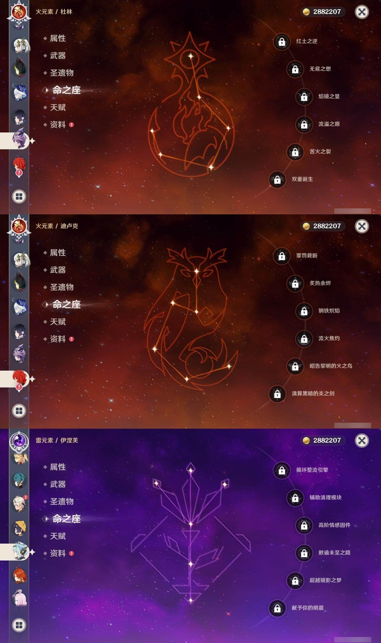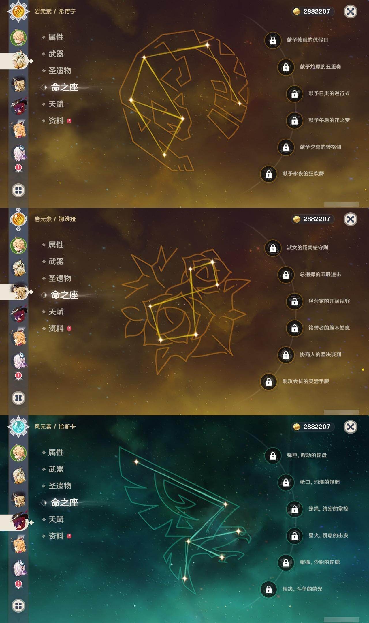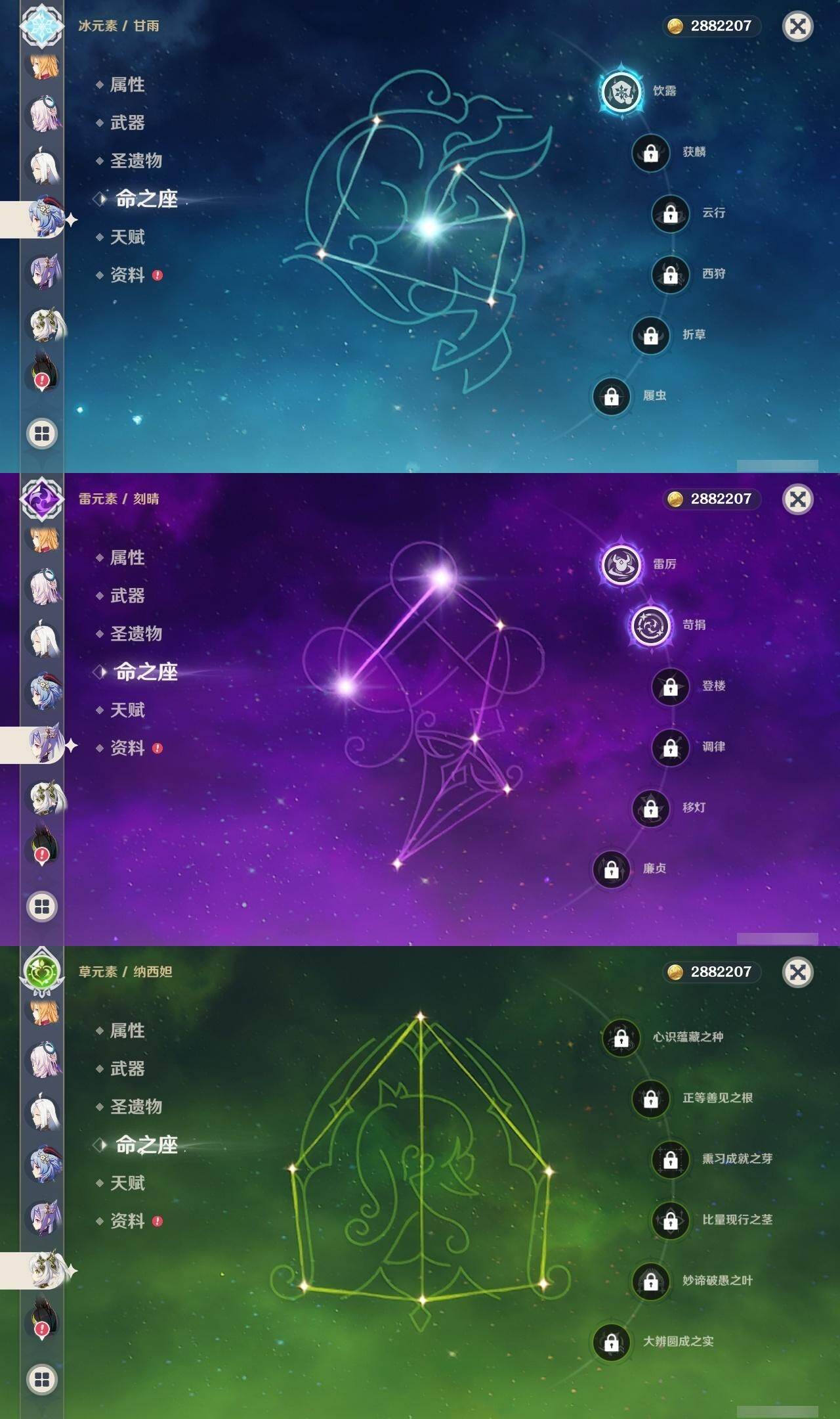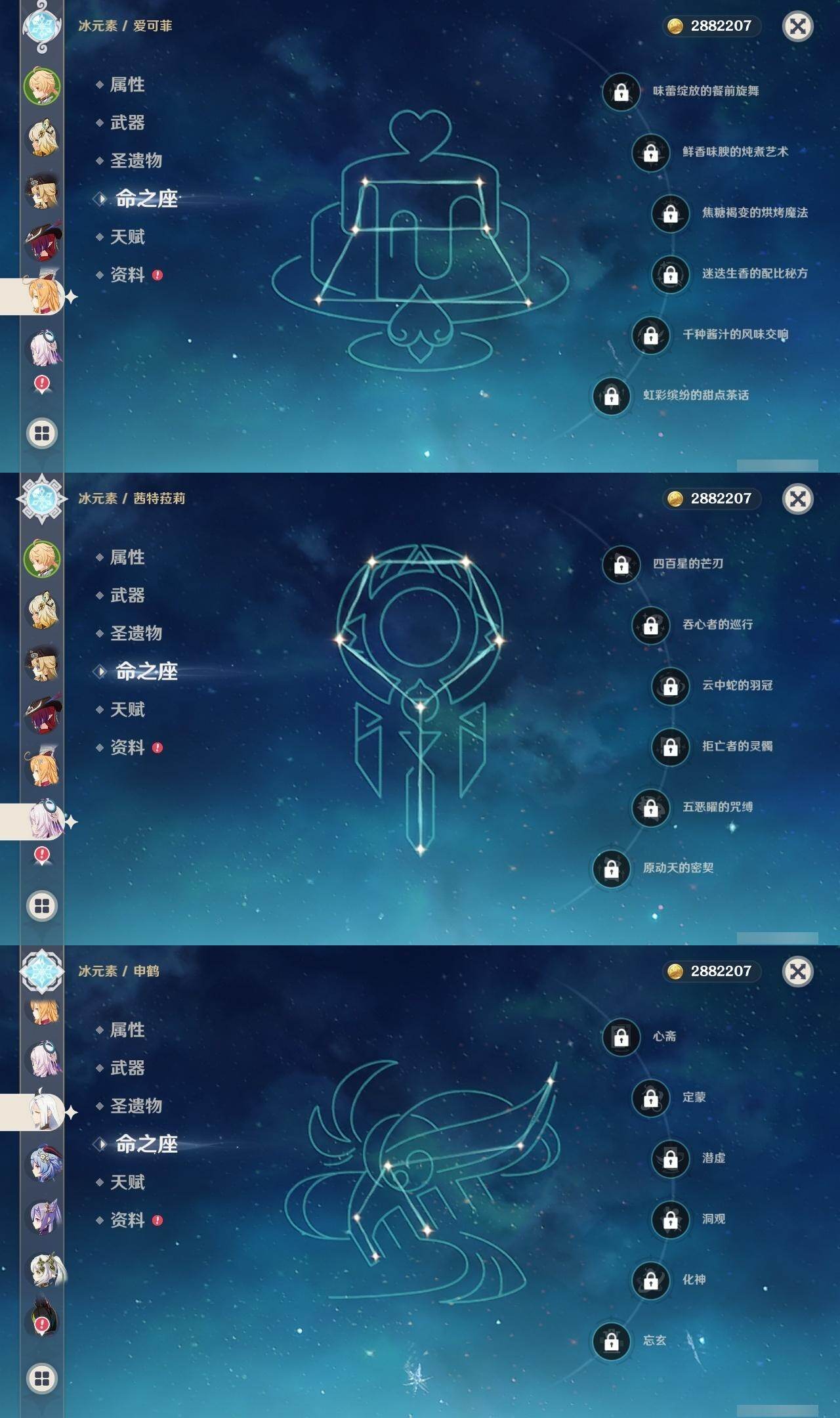 0命娜维娅,0命芙宁娜,0命那维莱特,1命迪希雅,0命纳西妲,2命提纳里,2命夜兰,0命申鹤,1命甘雨,0命魈,2命刻晴,0命琴,0命莫娜,0命迪卢克,0命希诺宁,0命恰斯卡,0命玛薇卡,0命茜特菈莉,0命梦见月瑞希,0命爱可菲,0命伊涅芙,0命杜林,精1白雨心弦,精1裁断,精1最初的大魔术,精1天空之脊,精1天空之翼,精1狼的末路,精1天空之傲,精1苍耀