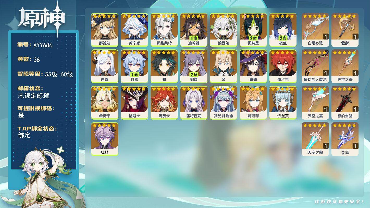 [17519354]60级/38黄/男主/22个五星角色/8个五星武器 0命娜维娅,0命芙宁娜,0命那维莱特,1命迪希雅,0命纳西妲,2命提纳里,2命夜兰,0命申鹤,1命甘雨,0命魈,2命刻晴,0命琴,0命莫娜,0命迪卢克,0命希诺宁,0命恰斯卡,0命玛薇卡,0命茜特菈莉,0命梦见月瑞希,0命爱可菲,0命伊涅芙,0命杜林,精1白雨心弦,精1裁断,精1最初的大魔术,精1天空之脊,精1天空之翼,精1狼的末路,精1天空之傲,精1苍耀