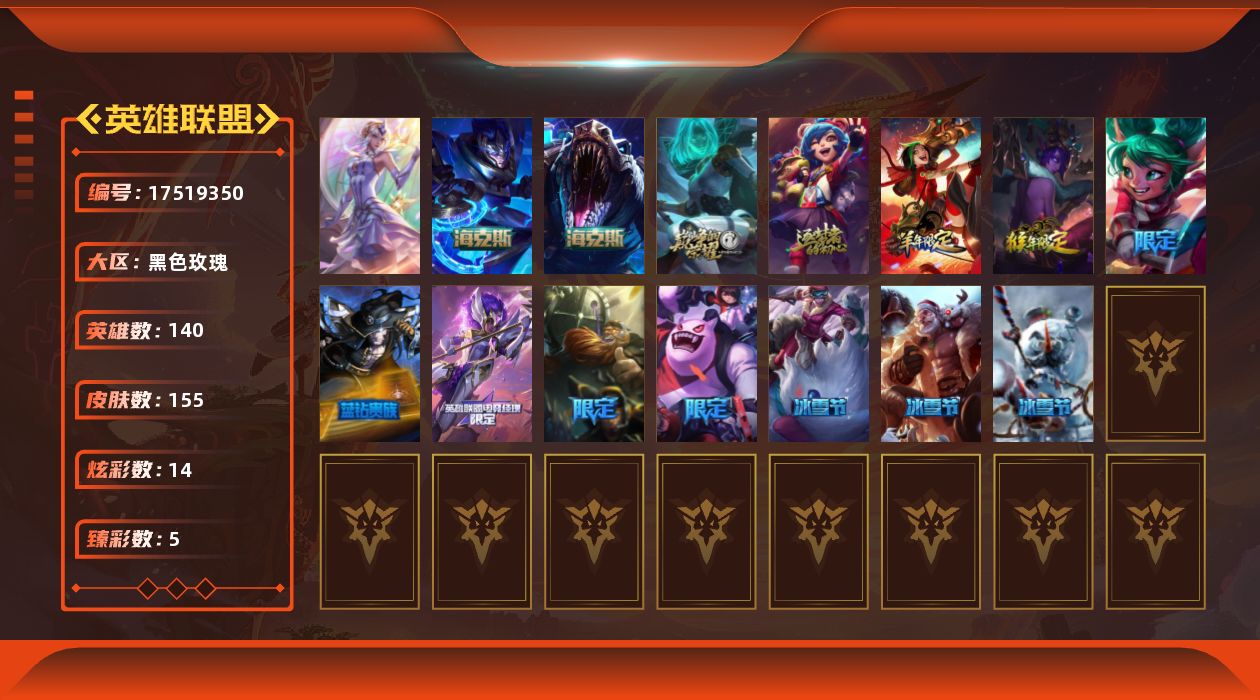 [17519350]未定级段位-140英雄-155皮肤-14炫彩-1终极-4神话-17限定-17传说-35史诗