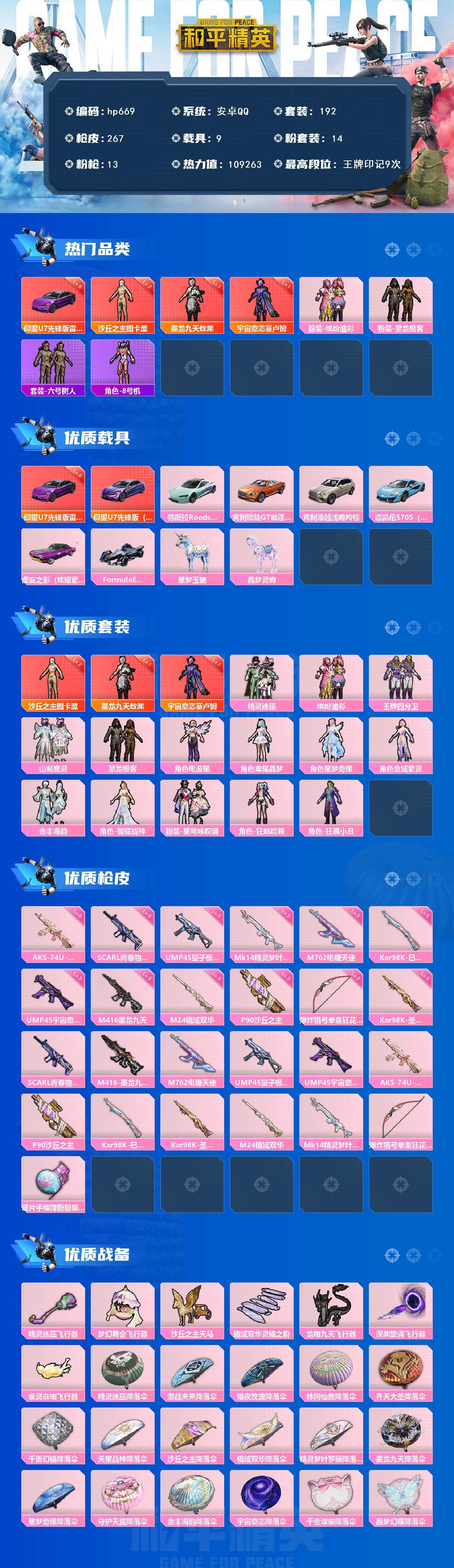 [17519408]安卓 手Q-3神装-14粉装-13特效枪-9载具-8粉色飞行器-109263热力值-9王牌印记-192套装-267枪皮 【红色载具】:仰望U7(雷霆紫)(六级) 【红色神装等级】:宇宙意志-塞卢姆(一级),墨龙九天-敖渊(一级),沙丘之主-图卡盟(二级) 【红色角色神装】:宇宙意志-塞卢姆,墨龙九天-敖渊,沙丘之主-图卡盟 【热门品类】:粉装-缤纷油彩,粉装-繁龙极客,套装-六号树人,角色-8号机 【粉色套装】:粉装-精灵迷巫,粉装-缤纷油彩,粉装-王牌四分卫,粉装-山涧鹿灵,粉装-繁龙极客,角色-电波星,角色-鸢尾晶梦,角色-星梦奇缘,角色-金域紫灵,粉装-金丰海韵,角色-智耀战神,粉装-星穹咏叹调,角色-狂魅哈莉,角色-狂魇小丑 【粉色枪皮等级】:SCAR-L-青春物语(五级),M416-墨龙九天(三级),M762-电糖天使(五级),UMP45-量子极限(五级),UMP45-宇宙意志(三级),AKS-74U-星穹咏叹调(六级),P90-沙丘之主(三级),Kar98K-巳巳如意(五级),Kar98K-圣域龙灵(二级),M24-镜域双华(三级),Mk14-精灵梦叶罗丽(五级),爆炸猎弓-拳皇·狂花道(二级) 【粉色载具】:仰望U7(雷霆紫),特斯拉Roadster(水滴蓝),宾利欧陆GT敞篷(火焰橘),宾利添越(浅瞪羚棕),迈凯伦570S(天际蓝),虚妄之影(炫耀紫),Formula E Gen2(幽光蓝),星梦玉骢,晶梦灵驹 【粉色枪皮】:SCAR-L-青春物语,M416-墨龙九天,M762-电糖天使,UMP45-量子极限,UMP45-宇宙意志,AKS-74U-星穹咏叹调,P90-沙丘之主,Kar98K-巳巳如意,Kar98K-圣域龙灵,M24-镜域双华,Mk14-精灵梦叶罗丽,爆炸猎弓-拳皇·狂花道,破片手榴弹-粉粉猫爪 【粉色飞行器】:精灵迷巫飞行器,梦幻舞会飞行器,沙丘之主天马,镜域双华-灵镜之阶,龙翔九天飞行器,深渊漩涡飞行器,雀灵庇佑飞行器 【粉色降落伞】:精灵迷巫降落伞,激战未来降落伞,暗夜玫瑰降落伞,林间仙鹿降落伞,齐天大圣降落伞,千面幻镜降落伞,天星战神降落伞,沙丘之主降落伞,镜域双华降落伞,精灵梦叶罗丽降落伞,墨龙九天降落伞,星梦奇缘降落伞,守护天翼降落伞,金丰海韵降落伞,宇宙意志降落伞,千金淑猫降落伞,晶梦幻蝶降落伞,樱桃泡泡降落伞,智耀战神