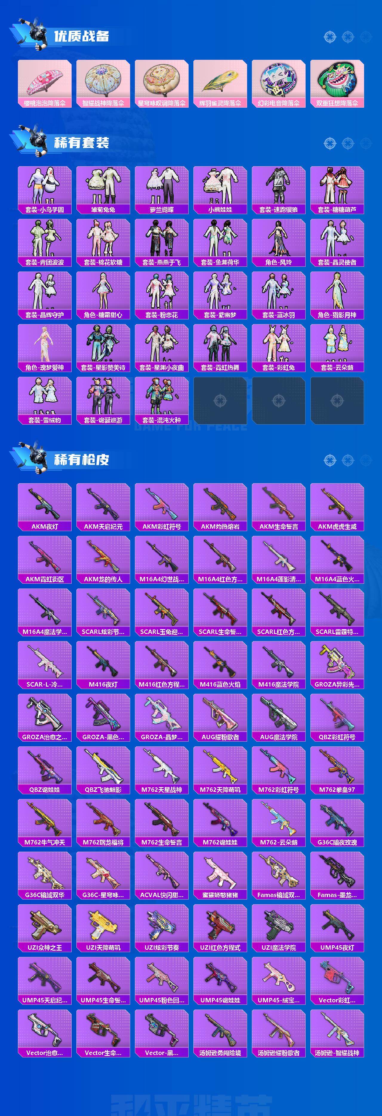 SCAR-L-青春物语,M416-墨龙九天,M762-电糖天使,UMP45-量子极限,UMP45-宇宙意志,P90-沙丘之主,Kar98K-巳巳如意,Kar98K-圣域龙灵,M24-镜域双华,Mk14-精灵梦叶罗丽,爆炸猎弓-拳皇·狂花道,破片手榴弹-粉粉猫爪