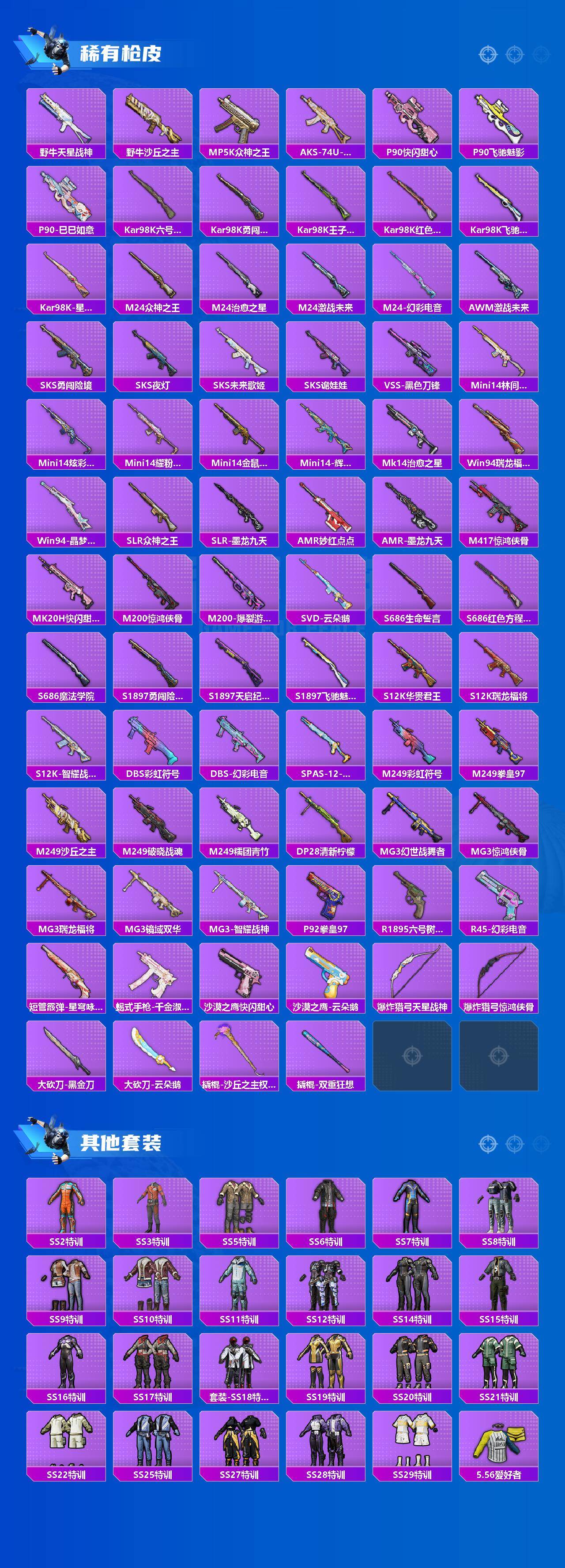 【粉色枪皮】:SCAR-L-青春物语,M416-墨龙九天,M762-电糖天使,UMP45-量子极限,UMP45-宇宙意志,AKS-74U-星穹咏叹调,P90-沙丘之主,Kar98K-巳巳如意,Kar98K-圣域龙灵,M24-镜域双华,Mk14-精灵梦叶罗丽,爆炸猎弓-拳皇·狂花道,破片手榴弹-粉粉猫爪