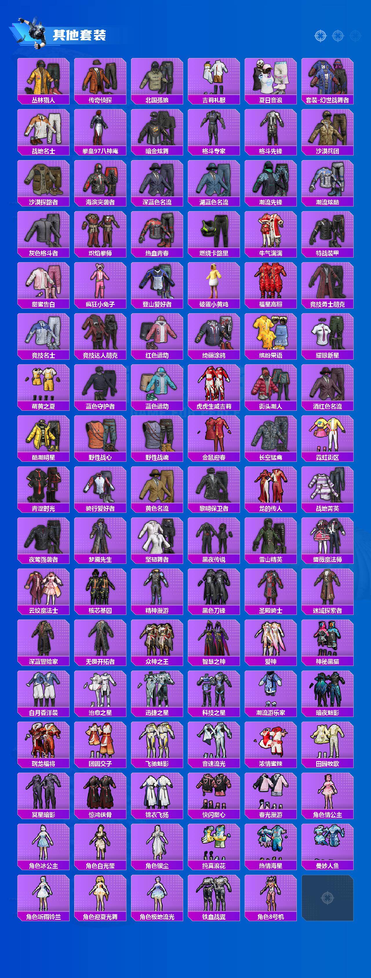 【粉色套装】:粉装-精灵迷巫,粉装-缤纷油彩,粉装-王牌四分卫,粉装-山涧鹿灵,粉装-繁龙极客,角色-电波星,角色-鸢尾晶梦,角色-星梦奇缘,角色-金域紫灵,粉装-金丰海韵,角色-智耀战神,粉装-星穹咏叹调,角色-狂魅哈莉,角色-狂魇小丑