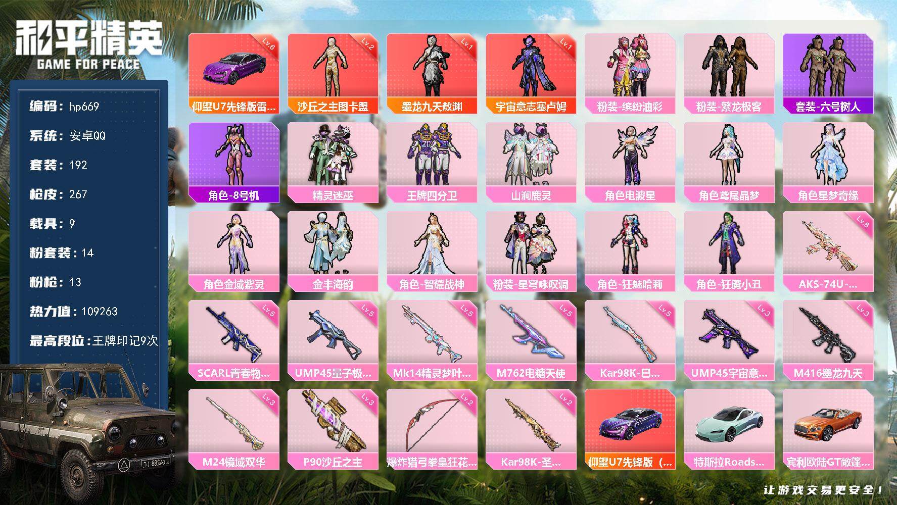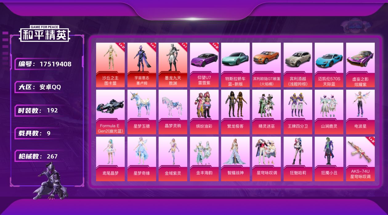 [17519408]安卓 手Q-3神装-14粉装-13特效枪-9载具-8粉色飞行器-109263热力值-9王牌印记-192套装-267枪皮