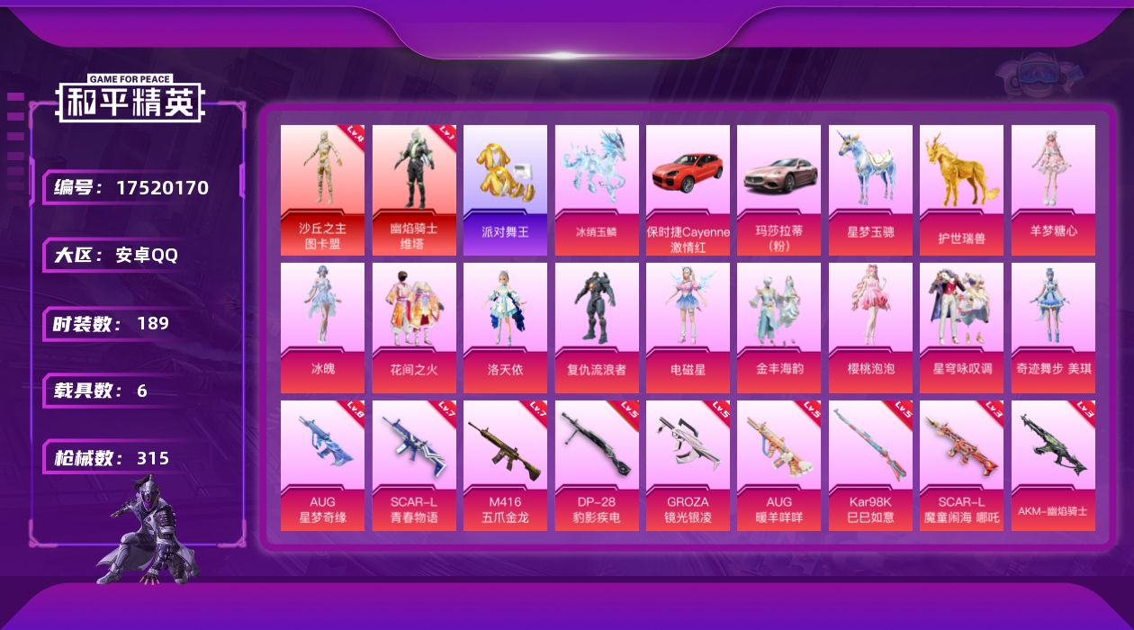 [17520170]安卓 手Q-3神装-12粉装-22特效枪-6载具-13粉色飞行器-114240热力值-18王牌印记-189套装-315枪皮 【红色神装等级】:灵驹仙姬-云歌(一级),幽焰骑士-维塔(一级),沙丘之主-图卡盟(四级) 【红色角色神装】:灵驹仙姬-云歌,幽焰骑士-维塔,沙丘之主-图卡盟 【热门品类】:套装-派对舞王,套装-龟仙人,角色-8号机,角色-Mark.06 【粉色套装】:粉装-花间之火,角色-洛天依,角色-复仇流浪者,角色-电磁星,粉装-金丰海韵,角色-樱桃泡泡,粉装-星穹咏叹调,角色-奇迹舞步 美琪,角色-冰魄,角色-羊梦糖心,角色-月中灵,人物-小舞·雪昙 【粉色枪皮等级】:AKM-幽焰骑士(三级),AKM-暮色玫影(三级),SCAR-L-青春物语(七级),SCAR-L-魔童闹海 哪吒(三级),SCAR-L-灵驹仙姬(二级),M416-五爪金龙(七级),GROZA-镜光银凌(五级),AUG-星梦奇缘(八级),AUG-暖羊咩咩(五级),AUG-罪夜之冕(一级),ACE32-萌骑漫游(一级),UMP45-宇宙意志(三级),UMP45-萌骑冒险(一级),AKS-74U-森灵之息(五级),Kar98K-巳巳如意(五级),Mk14-福马献瑞(五级),AA12-G-萌骑幻想(二级),DP-28-圣堂之誓(一级),DP-28-千金淑猫(二级),DP-28-豹影疾电(五级),PKM-萌骑夺宝(一级),信号枪-金乌曜日(五级) 【粉色载具】:玛莎拉蒂Ghibli(粉),保时捷Cayenne(激情红),星梦玉骢,护世瑞兽,冰绡玉鳞,九霄玄鹿 【粉色枪皮】:AKM-幽焰骑士,AKM-暮色玫影,SCAR-L-青春物语,SCAR-L-魔童闹海 哪吒,SCAR-L-灵驹仙姬,M416-五爪金龙,GROZA-镜光银凌,AUG-星梦奇缘,AUG-暖羊咩咩,AUG-罪夜之冕,ACE32-萌骑漫游,UMP45-宇宙意志,UMP45-萌骑冒险,AKS-74U-森灵之息,Kar98K-巳巳如意,Mk14-福马献瑞,AA12-G-萌骑幻想,DP-28-圣堂之誓,DP-28-千金淑猫,DP-28-豹影疾电,PKM-萌骑夺宝,信号枪-金乌曜日 【粉色飞行器】:酣梦熊熊飞行器,香车宝马飞行器,炫彩糖果飞行器,祥瑞起舞飞行器,星梦奇缘飞行器,幽焰列车飞行器,万象金身飞行器,月下星之子飞行器,飞天猪飞行器,