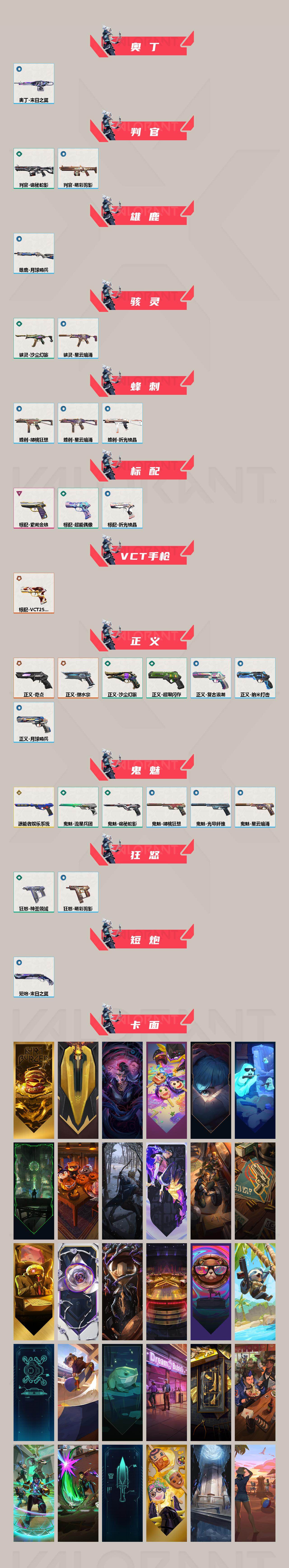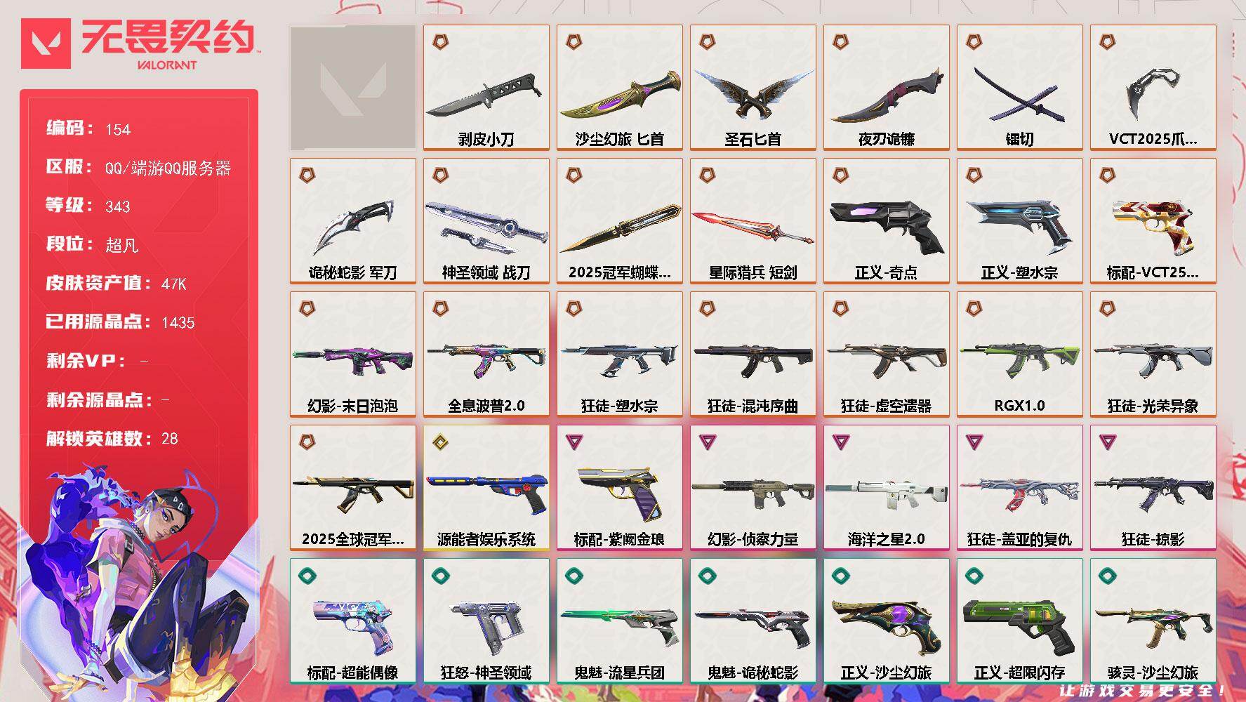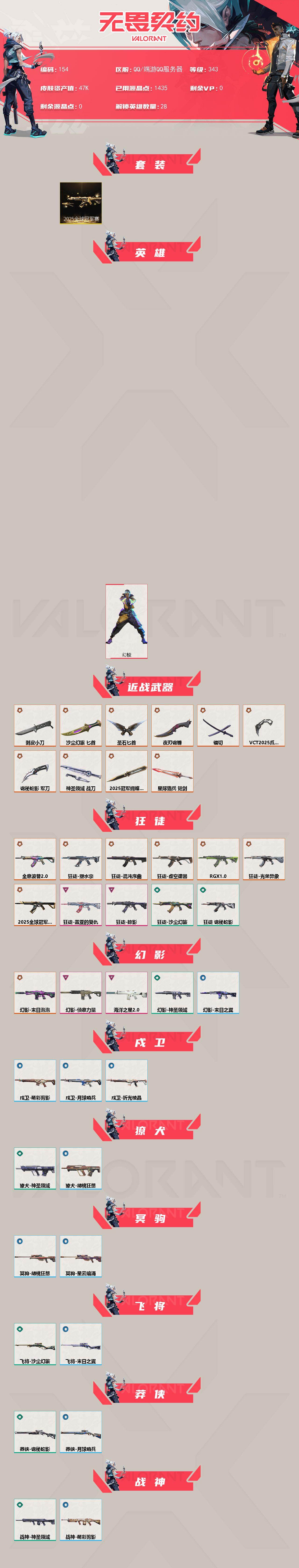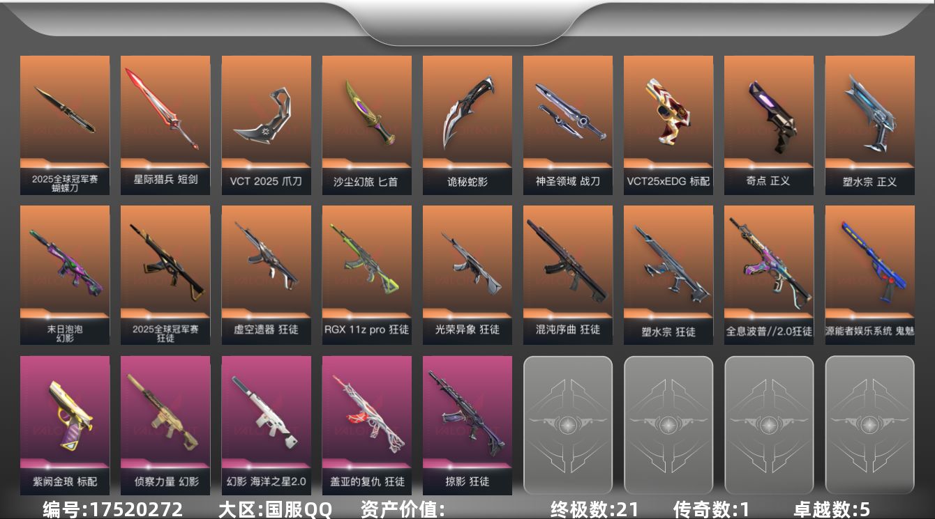 [17520272]【154】【套装】:2025全球冠军赛套装,VCT 2025 赛季套装 【英雄】:幻棱,炼狱,维斯,暮蝶,钛狐,壹决,铁臂,捷风,雷兹,幽影,不死鸟,贤者,猎枭,蝰蛇,零,芮娜,奇乐,尚勃勒,霓虹,斯凯,夜露,星礈,K/O,海神,盖可,黑梦,钢锁 【近战武器】:近战武器-2025全球冠军赛 蝴蝶刀,近战武器-剥皮小刀,近战武器-VCT 2025 爪刀,近战武器-镭切,近战武器-沙尘幻旅 匕首,近战武器-圣石匕首,近战武器-夜刃诡镰,近战武器-诡秘蛇影 军刀,近战武器-神圣领域 战刀,近战武器-星际猎兵 短剑 【狂徒】:狂徒-2025全球冠军赛,狂徒-混沌序曲,狂徒-全息波普//2.0,狂徒-塑水宗,狂徒-虚空遗器,狂徒-RGX 11z Pro,狂徒-光荣异象,狂徒-掠影,狂徒-盖亚的复仇,狂徒-沙尘幻旅,狂徒-诡秘蛇影 【幻影】:幻影-末日泡泡,幻影-侦察力量,幻影-海洋之星//2.0,幻影-神圣领域,幻影-末日之翼 【戍卫】:戍卫-萌彩剪影,戍卫-月球哨兵,戍卫-折光棱晶 【獠犬】:獠犬-神圣领域,獠犬-胡桃狂想 【冥驹】:冥驹-胡桃狂想,冥驹-星云暗涌 【飞将】:飞将-沙尘幻旅,飞将-末日之翼 【莽侠】:莽侠-诡秘蛇影,莽侠-月球哨兵 【战神】:战神-神圣领域,战神-萌彩剪影 【奥丁】:奥丁-末日之翼 【判官】:判官-诡秘蛇影,判官-萌彩剪影 【雄鹿】:雄鹿-月球哨兵 【骇灵】:骇灵-沙尘幻旅,骇灵-星云暗涌 【蜂刺】:蜂刺-胡桃狂想,蜂刺-星云暗涌,蜂刺-折光棱晶 【标配】:标配-紫阙金琅,标配-超能偶像,标配-折光棱晶 【VCT手枪】:标配-VCT25 x EDG 【正义】:正义-奇点,正义-塑水宗,正义-超限闪存,正义-沙尘幻旅,正义-复古浪潮,正义-纳米打击,正义-月球哨兵 【鬼魅】:鬼魅-源能者娱乐系统,鬼魅-流星兵团,鬼魅-诡秘蛇影,鬼魅-光导纤维,鬼魅-胡桃狂想,鬼魅-星云暗涌 【狂怒】:狂怒-神圣领域,狂怒-萌彩剪影 【短炮】:短炮-末日之翼 【卡面】:终章:激斗汉堡 卡面,进入射程 卡面,分崩离析 卡面,瓦娃脸雪糕 P2 卡面,《双城之战》拥抱 卡面,精灵大战 卡面,欢迎来到底城 卡面,南瓜盛典 卡面,钢弓与箭弦 卡面,无畏契约:暮蝶 卡面,修车达人 卡面,正义的化身 卡面,终章:生意人麦宝 卡面,铁之华 卡面,时间到 卡面,最高舞台 卡面,