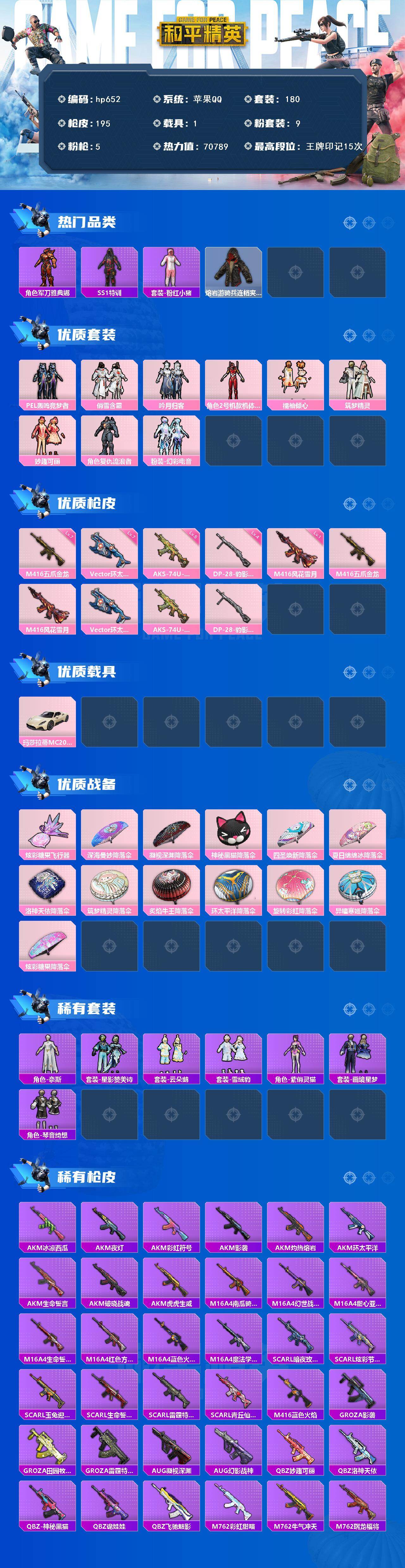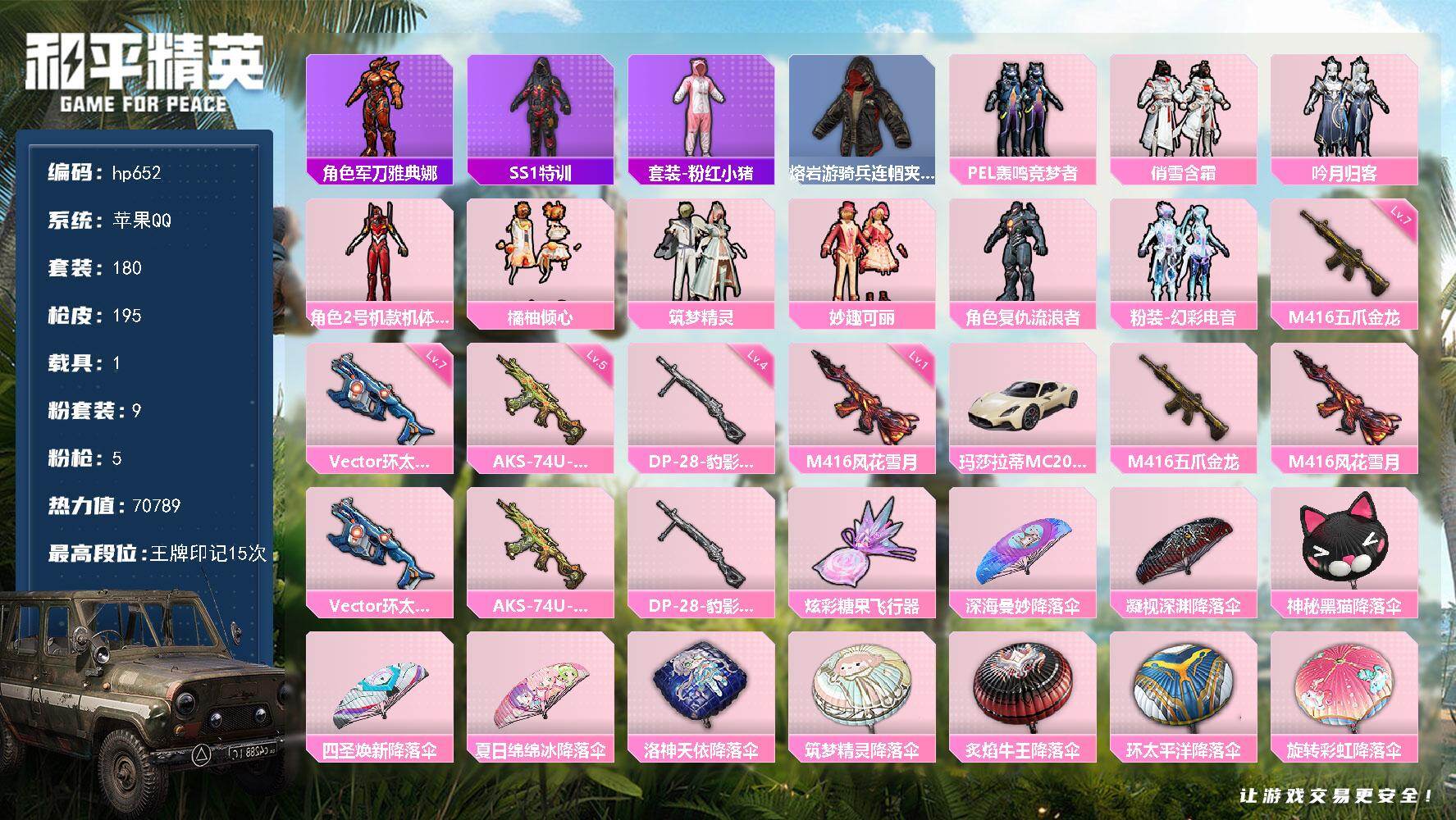 [17521102]苹果 手Q-9粉装-5特效枪-1载具-1粉色飞行器-70789热力值-15王牌印记-180套装-195枪皮 【热门品类】:角色-军刀雅典娜,套装-SS1特训,套装-粉红小猪,熔岩游骑兵连帽夹克 【粉色套装】:粉装-PEL轰鸣竞梦者,粉装-俏雪含霜,粉装-吟月归客,角色-2号机款机体服,粉装-橘柚倾心,粉装-筑梦精灵,粉装-妙趣可丽,角色-复仇流浪者,粉装-幻彩电音 【粉色枪皮等级】:M416-五爪金龙(七级),M416-风花雪月(一级),Vector-环太平洋(七级),AKS-74U-森灵之息(五级),DP-28-豹影疾电(四级) 【粉色载具】:玛莎拉蒂MC20(星石白) 【粉色枪皮】:M416-五爪金龙,M416-风花雪月,Vector-环太平洋,AKS-74U-森灵之息,DP-28-豹影疾电 【粉色飞行器】:炫彩糖果飞行器 【粉色降落伞】:深海曼妙降落伞,凝视深渊降落伞,神秘黑猫降落伞,四圣焕新降落伞,夏日绵绵冰降落伞,洛神天依降落伞,筑梦精灵降落伞,炙焰牛王降落伞,环太平洋降落伞,旋转彩虹降落伞,异瞳寒姬降落伞,炫彩糖果降落伞 【稀有套装】:套装-雪国风尚,套装-炫彩糖果,角色-奈斯,套装-星影赞美诗,套装-云朵鹅,套装-雪绒豹,角色-紫俏灵猫,套装-画境星梦,套装-琴音绮想 【稀有枪皮】:AUG-冰晶雪宝,AKM-冰凉西瓜,AKM-夜灯,AKM-彩虹符号,AKM-影袭,AKM-灼热熔岩,AKM-环太平洋,AKM-生命誓言,AKM-破晓战魂,AKM-虎虎生威,M16A4-南瓜骑士,M16A4-幻世战舞者,M16A4-甜心亚梦,M16A4-生命誓言,M16A4-红色方程式,M16A4-蓝色火焰,M16A4-魔法学院,SCAR-L-暗夜玫瑰,SCAR-L-炫彩节奏,SCAR-L-玉兔迎春,SCAR-L-生命誓言,SCAR-L-雷霆特警,SCAR-L-青丘仙客,M416-蓝色火焰,GROZA-影袭,GROZA-田园牧歌,GROZA-雷霆特警,AUG-凝视深渊,AUG-幻影战神,QBZ-妙趣可丽,QBZ-洛神天依,QBZ-神秘黑猫,QBZ-诡娃娃,QBZ-飞驰魅影,M762-彩虹甜喵,M762-牛气冲天,M762-瑞龙福将,M762-甜心宝贝,M762-生命誓言,M762-诡娃娃,M762-云朵鹅,Mk47-洛神天依,G36C-暗夜玫瑰,G36C-青丘仙客,G36C
