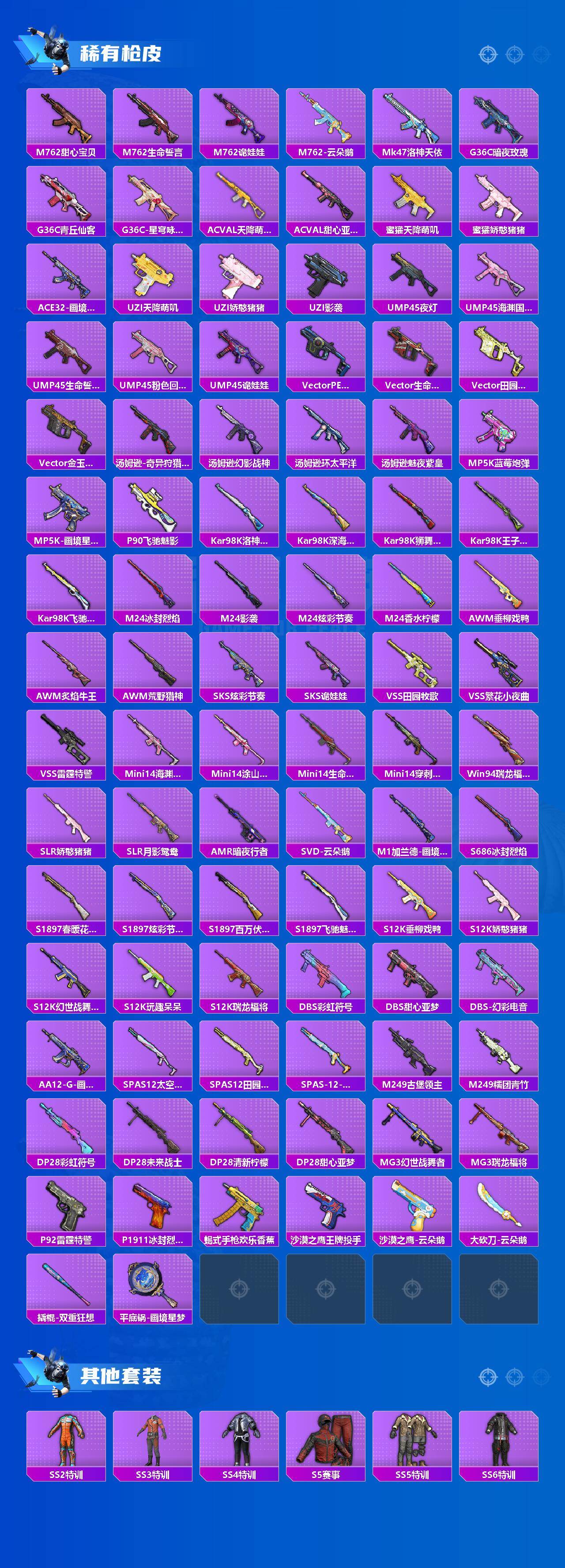 【稀有枪皮】:AUG-冰晶雪宝,AKM-冰凉西瓜,AKM-夜灯,AKM-彩虹符号,AKM-影袭,AKM-灼热熔岩,AKM-环太平洋,AKM-生命誓言,AKM-破晓战魂,AKM-虎虎生威,M16A4-南瓜骑士,M16A4-幻世战舞者,M16A4-甜心亚梦,M16A4-生命誓言,M16A4-红色方程式,M16A4-蓝色火焰,M16A4-魔法学院,SCAR-L-暗夜玫瑰,SCAR-L-炫彩节奏,SCAR-L-玉兔迎春,SCAR-L-生命誓言,SCAR-L-雷霆特警,SCAR-L-青丘仙客,M416-蓝色火焰,GROZA-影袭,GROZA-田园牧歌,GROZA-雷霆特警,AUG-凝视深渊,AUG-幻影战神,QBZ-妙趣可丽,QBZ-洛神天依,QBZ-神秘黑猫,QBZ-诡娃娃,QBZ-飞驰魅影,M762-彩虹甜喵,M762-牛气冲天,M762-瑞龙福将,M762-甜心宝贝,M762-生命誓言,M762-诡娃娃,M762-云朵鹅,Mk47-洛神天依,G36C-暗夜玫瑰,G36C-青丘仙客,G36C