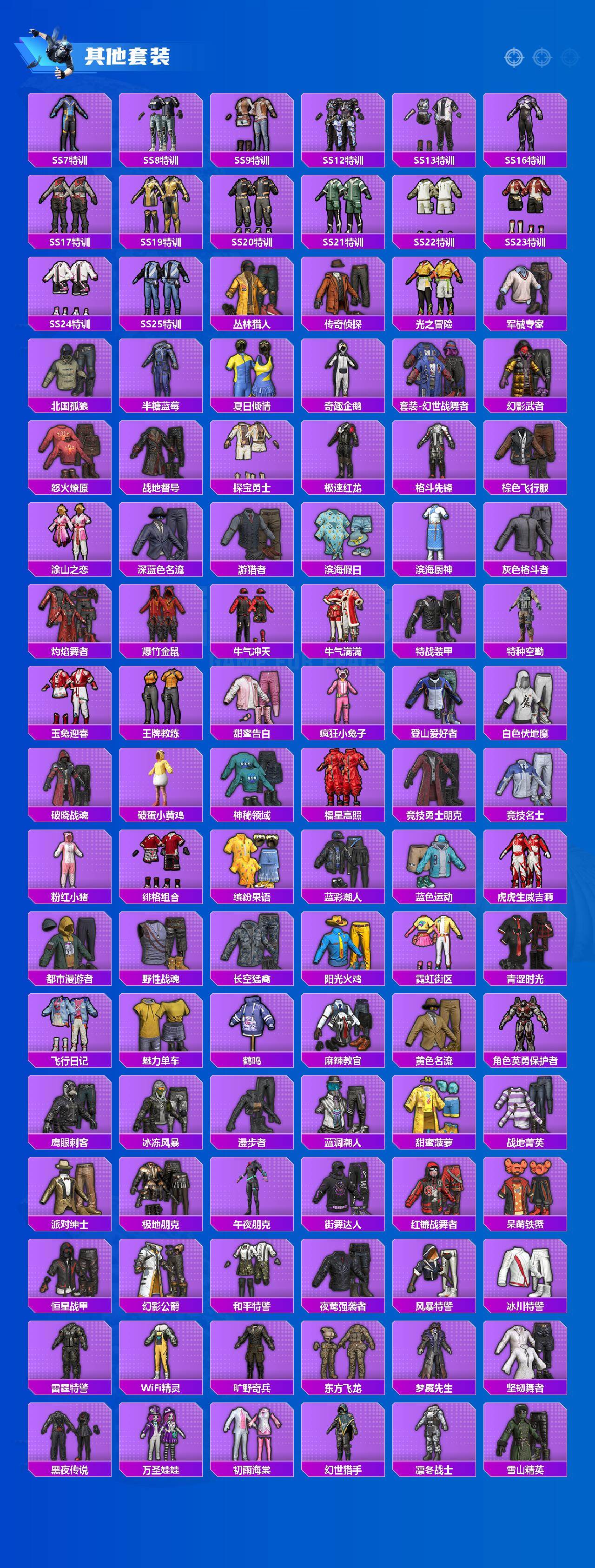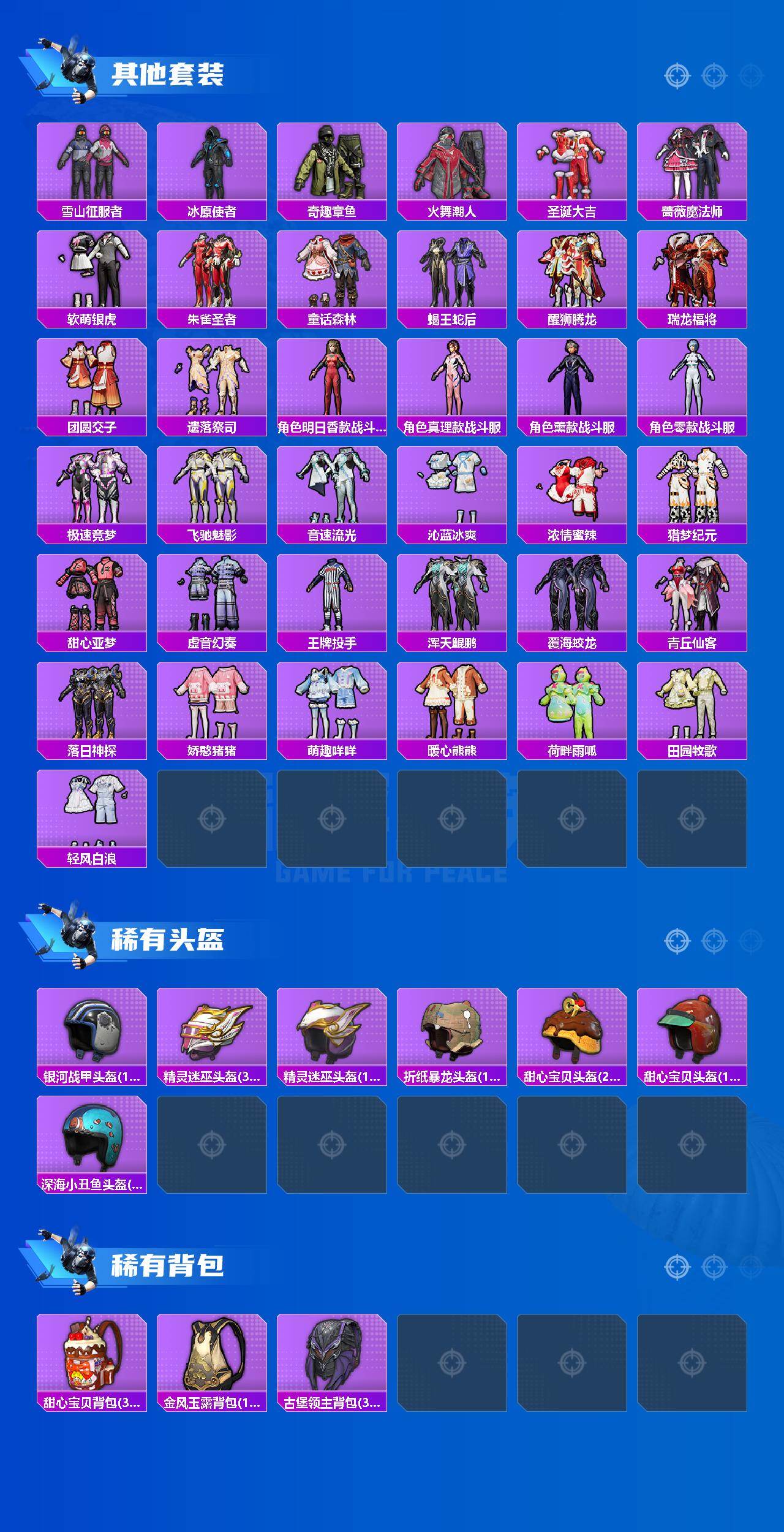 套装-PEL轰鸣竞梦者,套装-俏雪含霜,套装-吟月归客,角色-2号机款机体服,套装-橘柚倾心,套装-筑梦精灵,套装-妙趣可丽,角色-复仇流浪者,套装-鹰眼刺客,套装-呆萌铁蟹,套装-东方飞龙,套装-梦魇先生,套装-万圣娃娃,套装-软萌银虎
