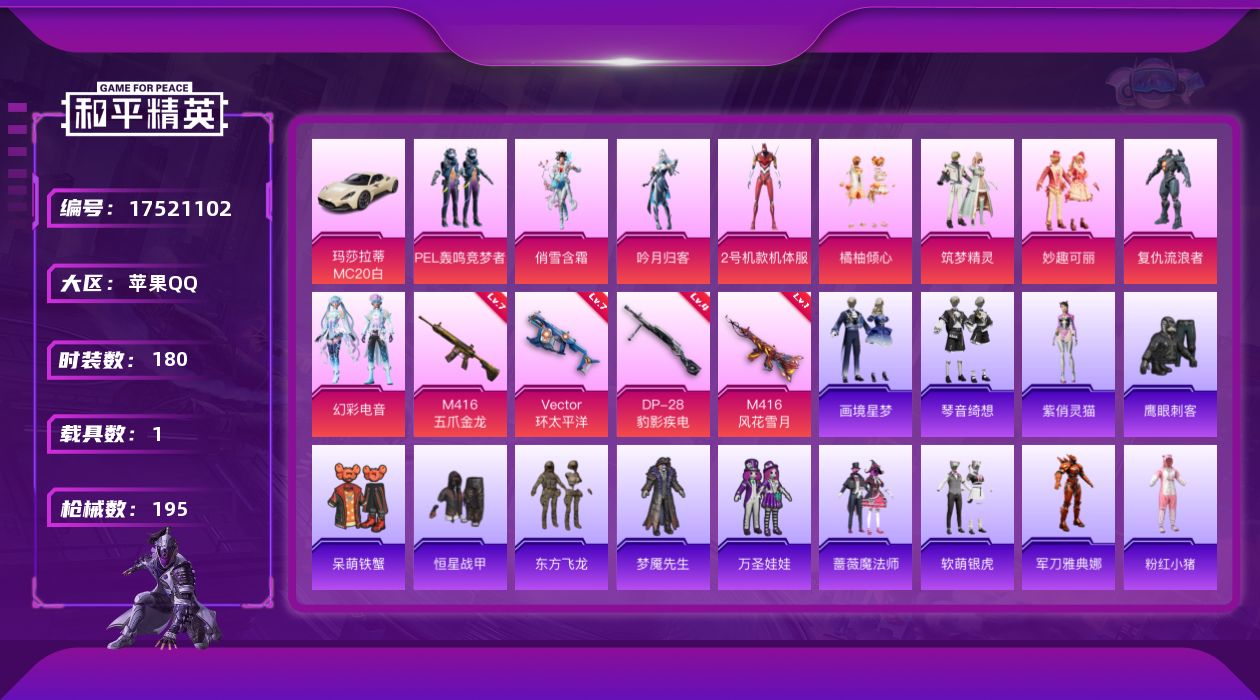 [17521102]苹果 手Q-9粉装-5特效枪-1载具-1粉色飞行器-70789热力值-15王牌印记-180套装-195枪皮