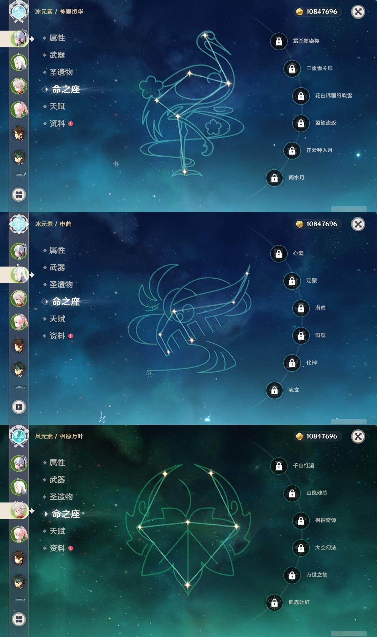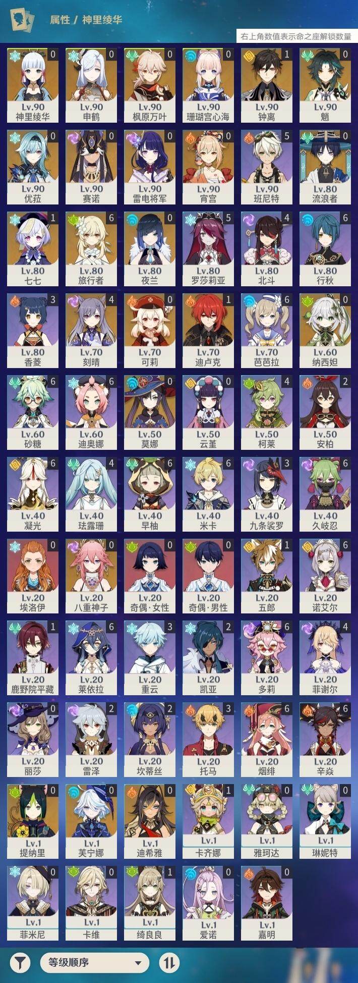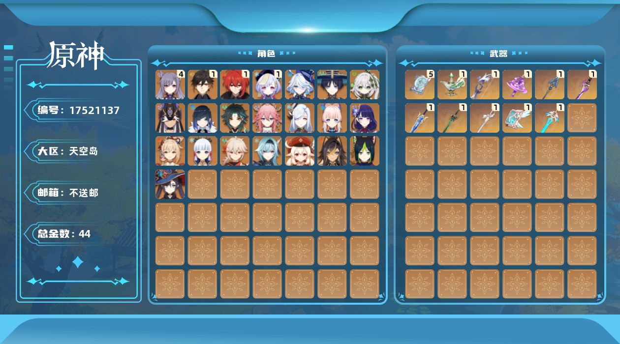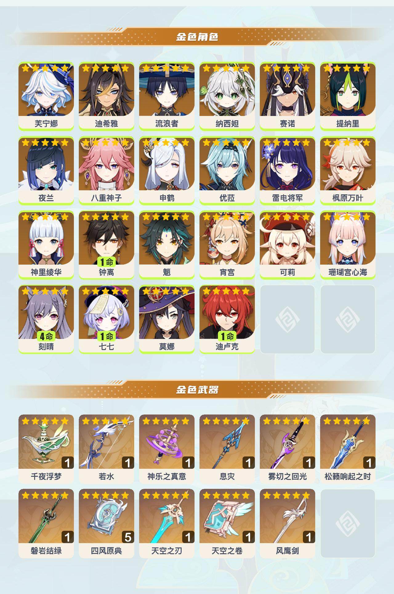 0命芙宁娜,0命迪希雅,0命流浪者,0命纳西妲,0命赛诺,0命提纳里,0命夜兰,0命八重神子,0命申鹤,0命优菈,0命雷电将军,0命枫原万叶,0命神里绫华,1命钟离,0命魈,0命宵宫,0命可莉,0命珊瑚宫心海,4命刻晴,1命七七,0命莫娜,1命迪卢克,精1千夜浮梦,精1若水,精1神乐之真意,精1息灾,精1雾切之回光,精1松籁响起之时,精1磐岩结绿,精5四风原典,精1天空之刃,精1天空之卷,精1风鹰剑