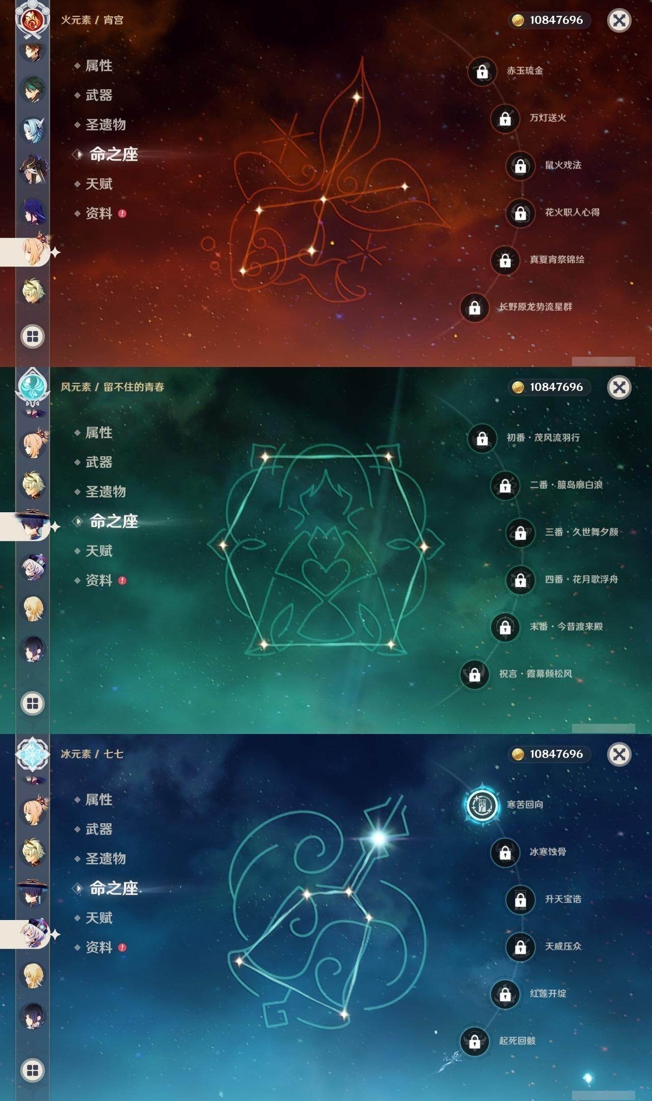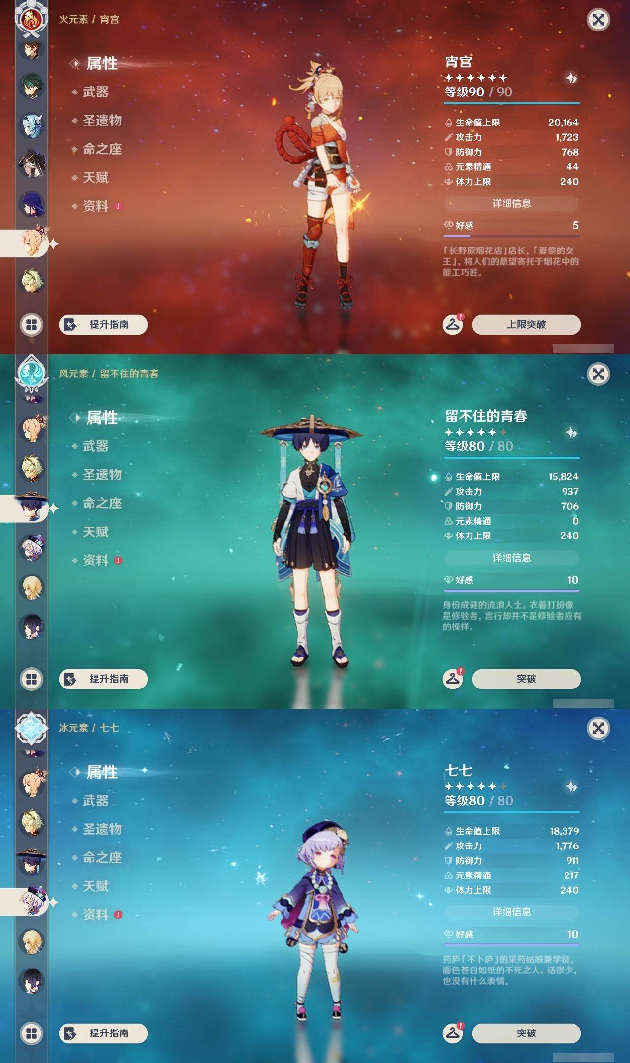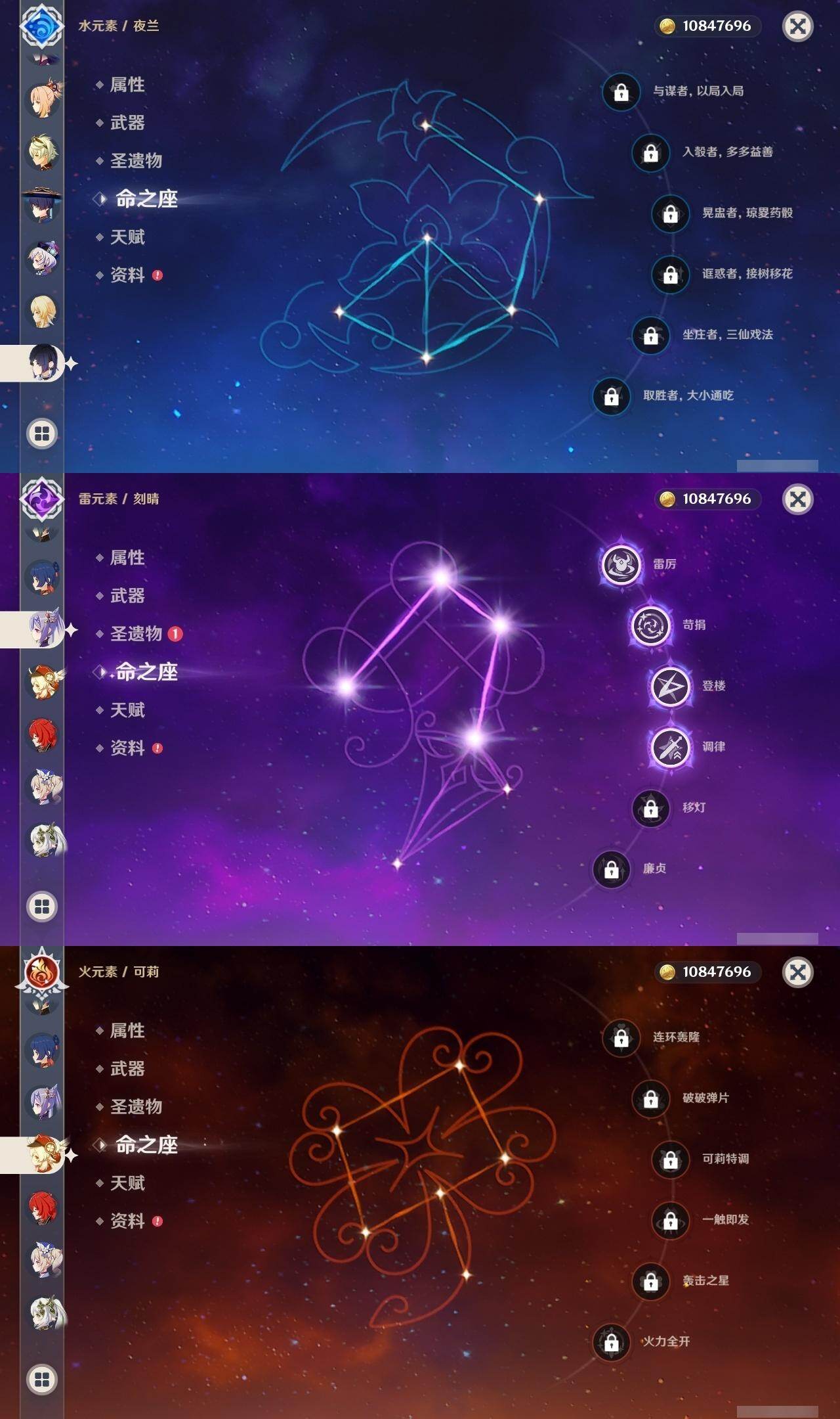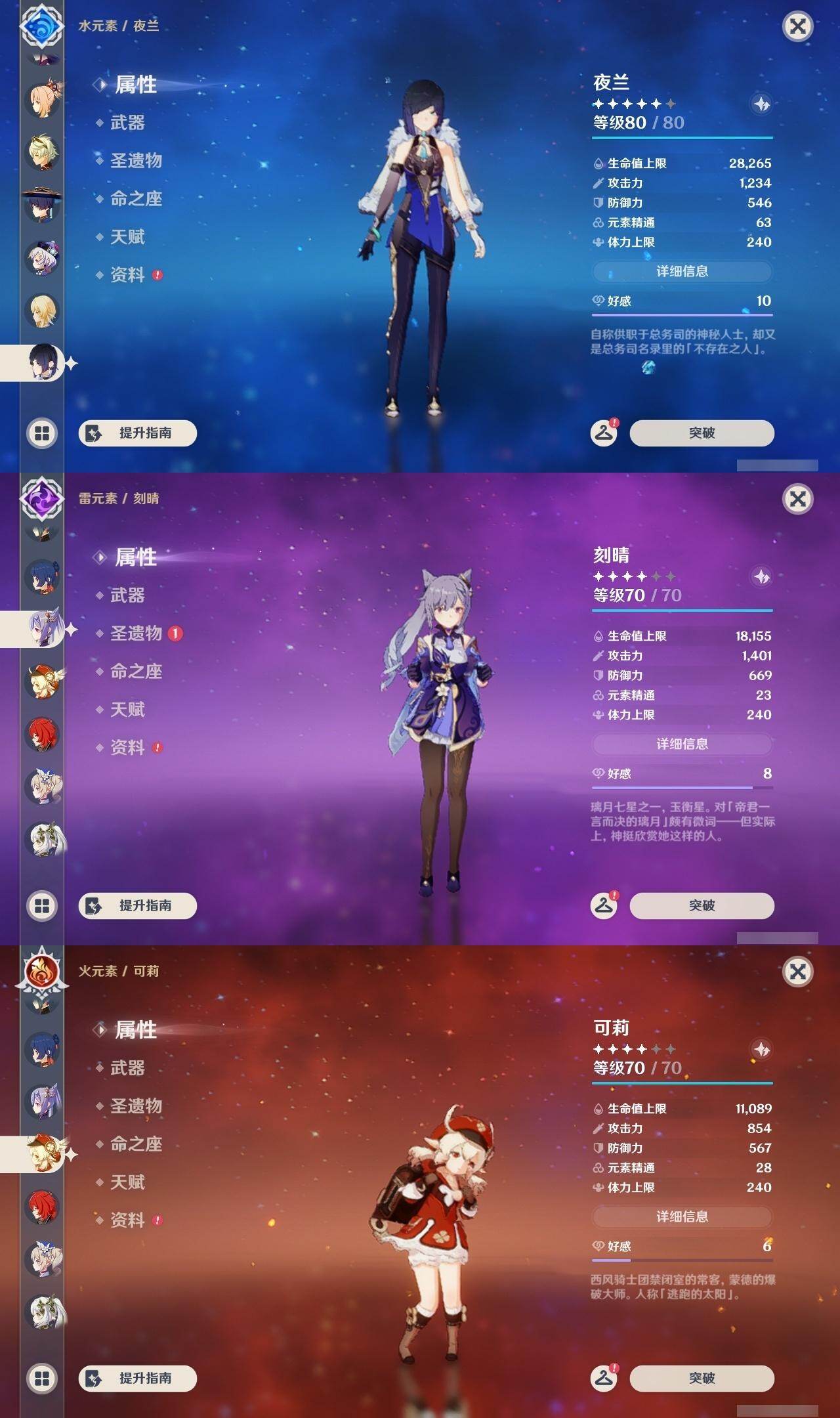 0命芙宁娜,0命迪希雅,0命流浪者,0命纳西妲,0命赛诺,0命提纳里,0命夜兰,0命八重神子,0命申鹤,0命优菈,0命雷电将军,0命枫原万叶,0命神里绫华,1命钟离,0命魈,0命宵宫,0命可莉,0命珊瑚宫心海,4命刻晴,1命七七,0命莫娜,1命迪卢克,精1千夜浮梦,精1若水,精1神乐之真意,精1息灾,精1雾切之回光,精1松籁响起之时,精1磐岩结绿,精5四风原典,精1天空之刃,精1天空之卷,精1风鹰剑