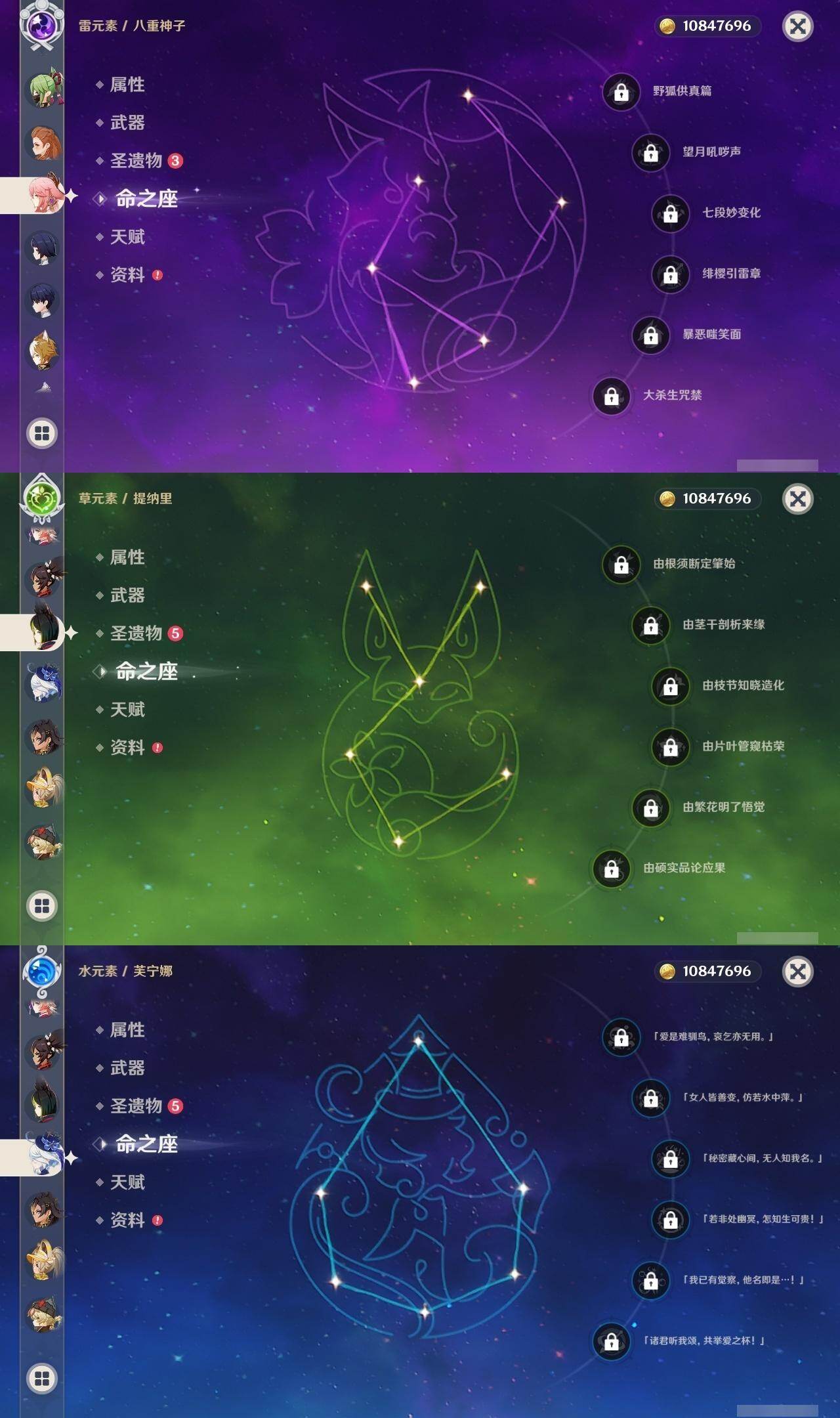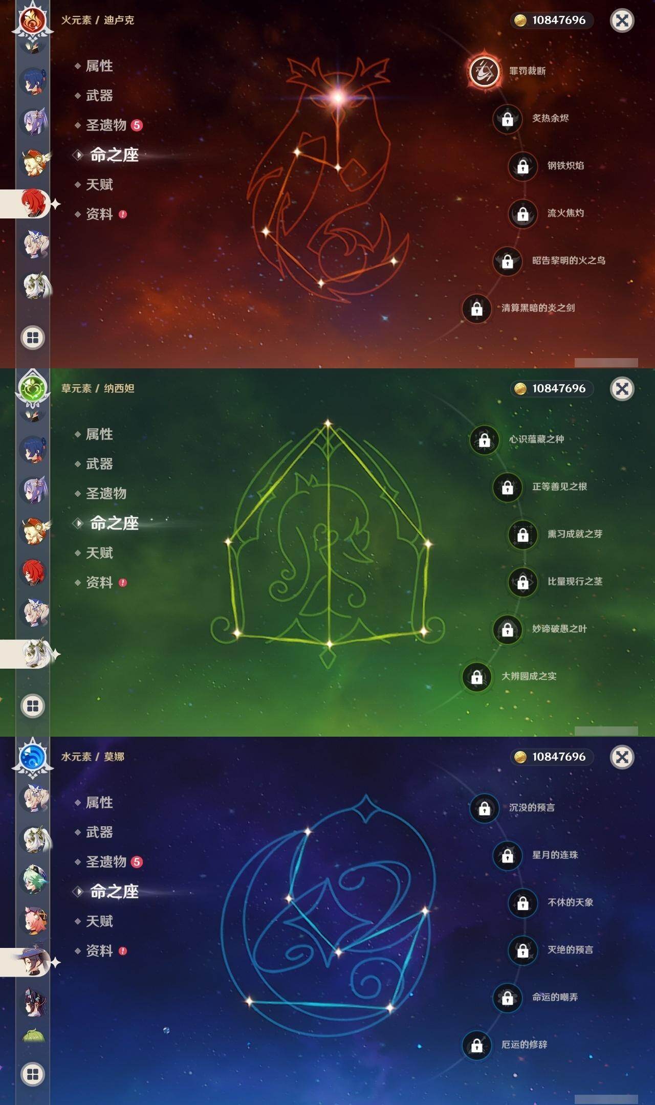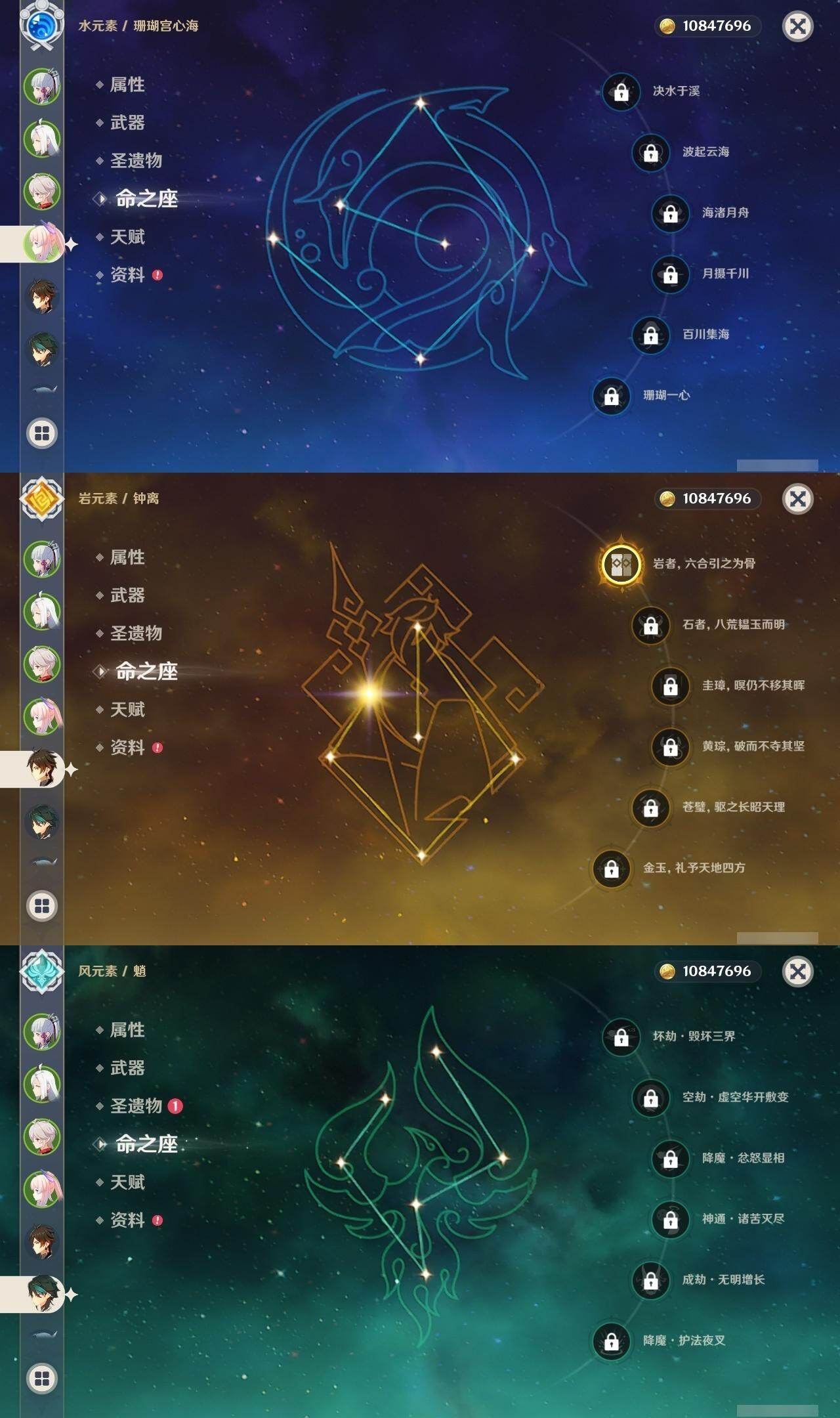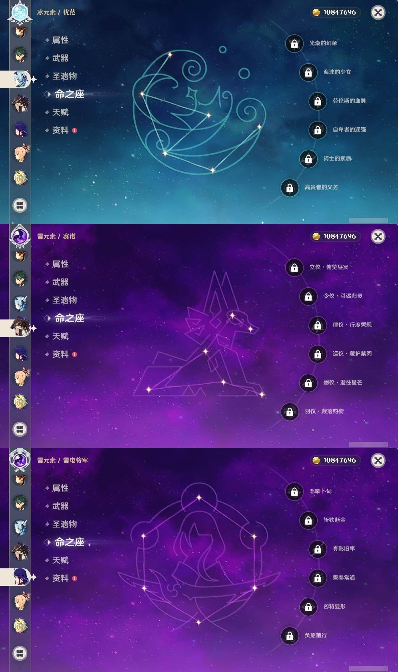 0命芙宁娜,0命迪希雅,0命流浪者,0命纳西妲,0命赛诺,0命提纳里,0命夜兰,0命八重神子,0命申鹤,0命优菈,0命雷电将军,0命枫原万叶,0命神里绫华,1命钟离,0命魈,0命宵宫,0命可莉,0命珊瑚宫心海,4命刻晴,1命七七,0命莫娜,1命迪卢克,精1千夜浮梦,精1若水,精1神乐之真意,精1息灾,精1雾切之回光,精1松籁响起之时,精1磐岩结绿,精5四风原典,精1天空之刃,精1天空之卷,精1风鹰剑