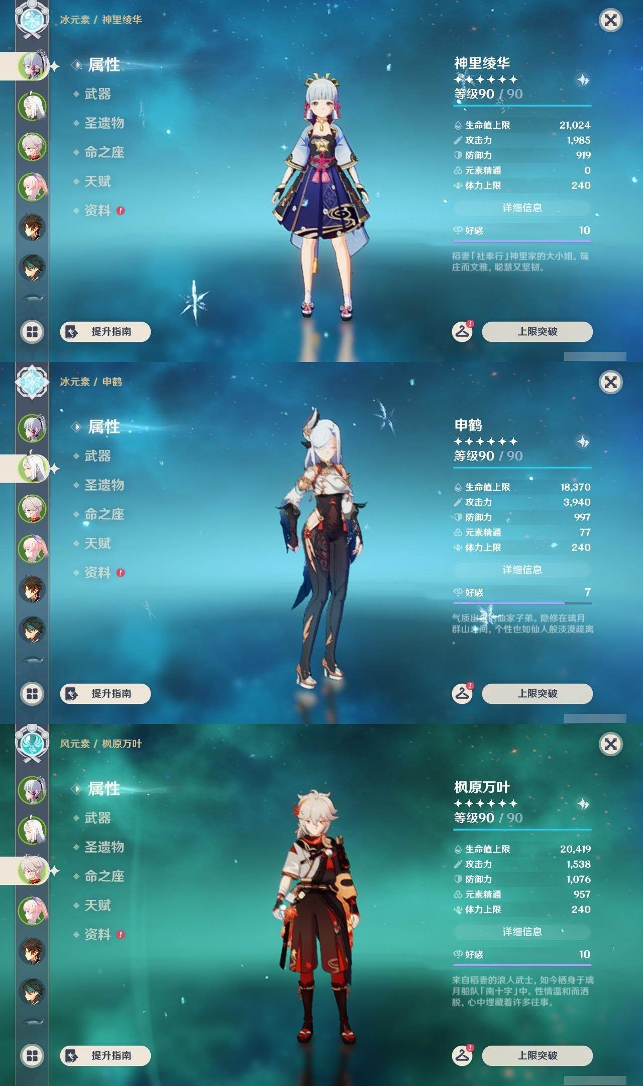 神里凌华,申鹤,枫原万叶,珊瑚宫心海,钟离,魈,优菈,雷电将军,宵宫,七七,刻晴,可莉,迪卢克,莫娜,八重神子