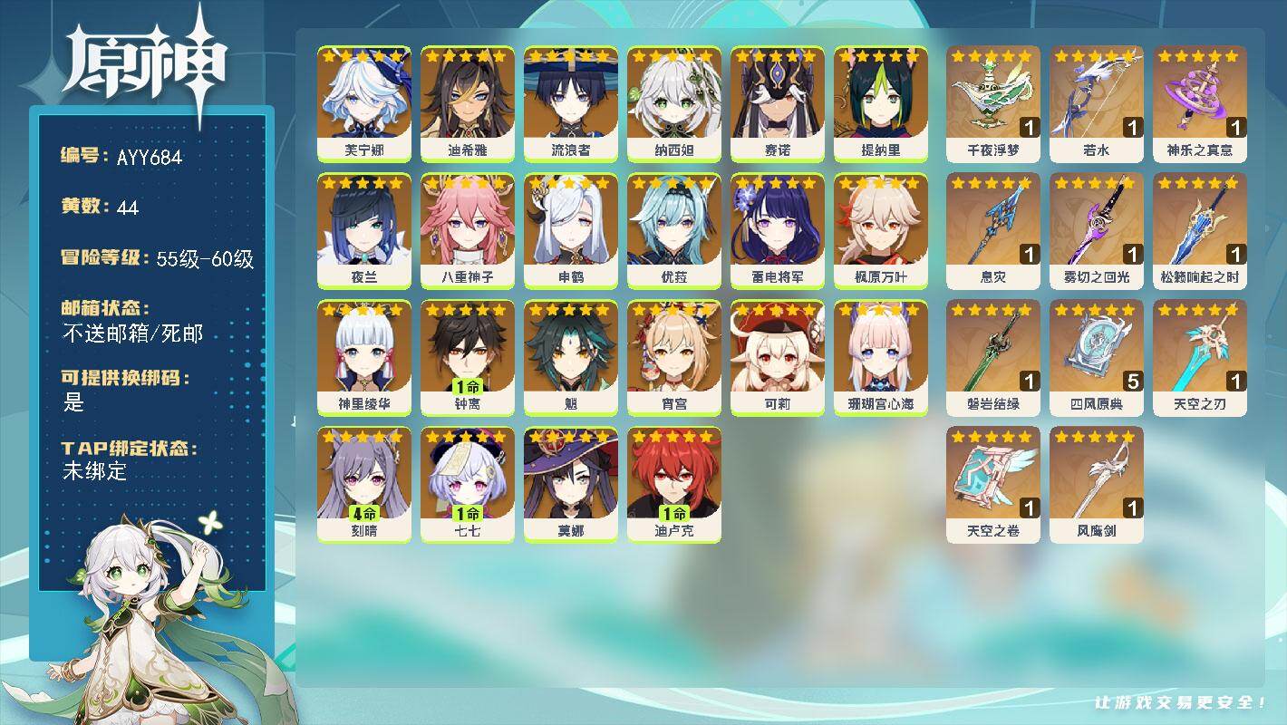[17521137]58级/44黄/女主/22个五星角色/11个五星武器 0命芙宁娜,0命迪希雅,0命流浪者,0命纳西妲,0命赛诺,0命提纳里,0命夜兰,0命八重神子,0命申鹤,0命优菈,0命雷电将军,0命枫原万叶,0命神里绫华,1命钟离,0命魈,0命宵宫,0命可莉,0命珊瑚宫心海,4命刻晴,1命七七,0命莫娜,1命迪卢克,精1千夜浮梦,精1若水,精1神乐之真意,精1息灾,精1雾切之回光,精1松籁响起之时,精1磐岩结绿,精5四风原典,精1天空之刃,精1天空之卷,精1风鹰剑