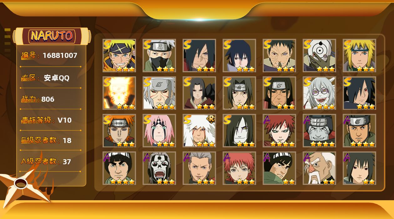 [16881007]18S级忍者数-37A级忍者数 【S级忍者】:千手扉间「秽土转生」(3星),千手柱间「秽土转生」(3星),宇智波鼬「秽土转生」(3星),宇智波斑「秽土转生·解」(3星),春野樱「忍界大战」(3星),宇智波带土「忍界大战」(3星),宇智波鼬「须佐能乎」(3星),旗木卡卡西「须佐能乎」(3星),宇智波斑「木叶创立」(3星),自来也「舞之豪杰」(3星),大蛇丸(3星),波风水门(3星),药师兜「仙人模式」(3星),漩涡鸣人「九喇嘛连结」(3星),佩恩「天道」(3星),宇智波佐助「永恒万花筒」(3星),宇智波斑 「白面具」(3星宇智波斑「白面具」),漩涡鸣人·宇智波佐助(3星) 【A级忍者】:长门「青年」(2星),波风水门「青年」(2星),波风水门「新春限定」(2星),迪达拉(2星),迪达拉「秽土转生」(2星),大蛇丸「晓」(2星),奇拉比(2星),飞段(3星),飞段「死司凭血」(3星),干柿鬼鲛(4星),漩涡博人「桃式显现」(2星),漩涡鸣人「仙人模式」(2星),漩涡鸣人「九尾查克拉」(2星),迈特凯(4星),旗木卡卡西「元气夏日」(2星),我爱罗「疾风传」(4星),我爱罗「忍界大战」(2星),蝎(3星),猿飞阿斯玛(4星),宇智波止水「新春限定」(2星),宇智波佐助「须佐能乎」(2星),宇智波佐助「疾风传咒印」(2星),宇智波佐助「万花筒写轮眼」(2星),药师兜「半蛇斗篷」(2星),日向宁次「忍界大战」(2星),宇智波带土「暴怒」(2星),长十郎「六代目水影」(2星),神秘面具男「忍者之路」(2星),佩恩·六道「漂泊浪客」(2星),李洛克「忍界大战」(2星),黑土「博人传」(2星),春野樱「百豪」(2星),千代「近松十人卫」(2星),不缘(2星),宇智波泉奈(2星),大野木「侠隐江湖」(2星),迈特凯「青春爆炸」(2星)