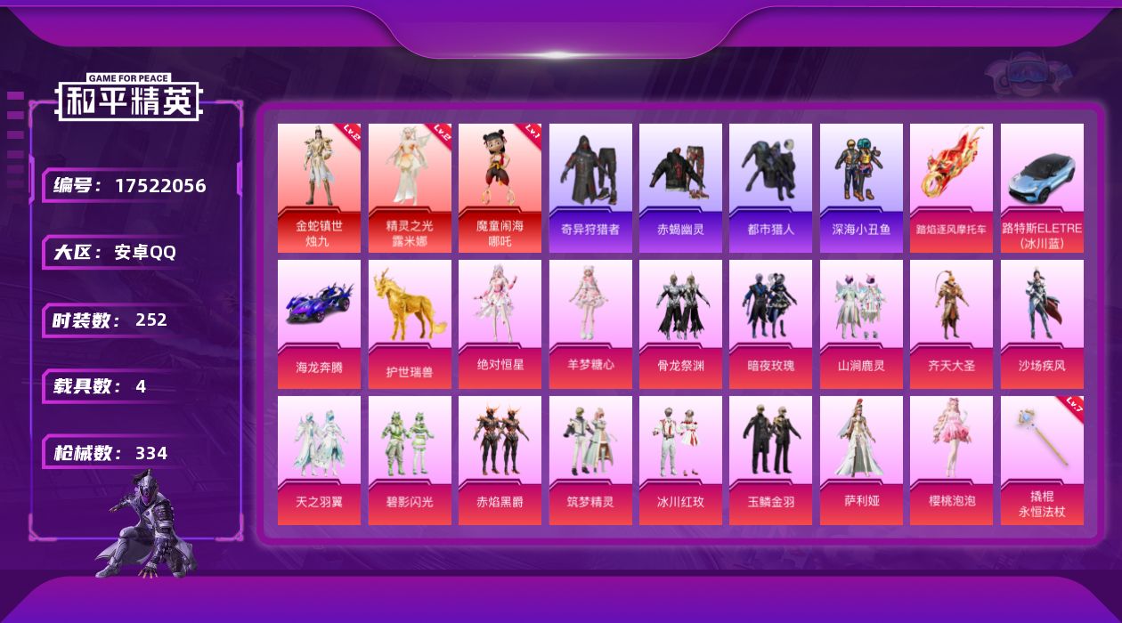 [17522056]安卓 手Q-3神装-15粉装-10特效枪-4载具-14粉色飞行器-122169热力值-8王牌印记-252套装-334枪皮