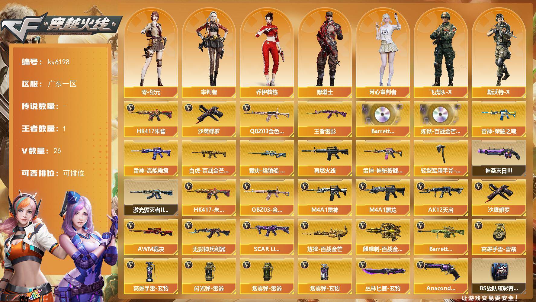 [17378770]【ky6198】广东一区-26V-1王者武器数-0炫金武器数 【热门武器】:QBZ03-金色蔷薇,HK417-朱雀,沙鹰-修罗 【王者炫金武器】:王者雷影 【音效卡】:Barrett-碧霄极光音效卡,炼狱-百战金芒-庆典舞曲音效卡 【皮肤】:白虎-百战金芒 皮肤,裁决-运输船 皮肤,雷神-荣耀之魄,雷神-高能霹雳 皮肤,M4A1-再燃火线,雷神-神秘按键 皮肤,轻型军用手斧-再燃火线 【角色】:审判者,零·纪元,乔伊教练,修道士,葵-阿尔法武装,芳心审判者,飞虎队-X,斯沃特-X 【挑战大师】:激光毁灭者III-白马银枪,神圣爆裂者-末日III 【英雄级武器】:M4A1-黑龙,M4A1-雷神,AK12-天启,HK417-朱雀,无影-神兵利器,SCAR Light-玄豹,QBZ03-金色蔷薇,机械迷城-穹宇,AWM-裁决,炼狱-百战金芒,沙鹰-修罗,Anaconda-玄豹,麒麟刺-百战金芒,丛林匕首-玄豹,高爆手雷-雷暴,高爆手雷-玄豹*3,闪光弹-雷暴,烟雾弹-雷暴,烟雾弹-玄豹*2,Barrett-碧霄极光 【道具】:鲨鲨水溅跃背包,BS战队炫彩背包,云山科技背包,百战金芒炫彩背包,超级背包,女皇终结者-魔龙之吻,救世主-黑桃战神,绿色巨人,灵魂忍者*2,变异宝贝,迷雾幽灵*3,夺命之镰,防化服*3,语音特效-盛典烟火,萌萌小葵表情,防弹头盔,防弹衣,C4工具钳,手雷包 【特殊枪械】: