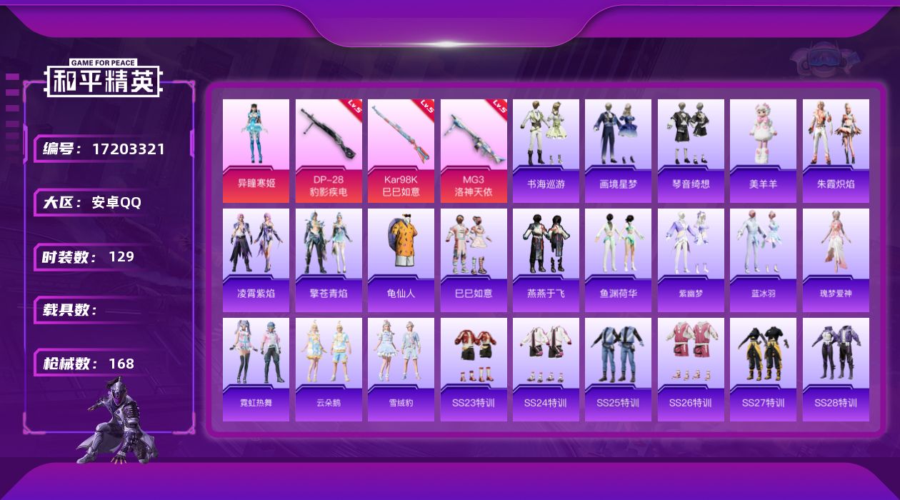 [17203321]【1748】安卓 手Q-1粉装-3特效枪-0载具-1粉色飞行器-43575热力值-8王牌印记-129套装-168枪皮 【热门品类】:套装-龟仙人 【粉色套装】:角色-异瞳寒姬 【粉色枪皮等级】:Kar98K-巳巳如意(五级),DP-28-豹影疾电(五级),MG3-洛神天依(五级) 【粉色枪皮】:Kar98K-巳巳如意,DP-28-豹影疾电,MG3-洛神天依 【粉色飞行器】:炫彩糖果飞行器 【粉色降落伞】:绝对恒星降落伞,星之彼岸降落伞,洛神天依降落伞,喜羊羊与灰太狼降落伞,炫彩糖果降落伞 【稀有套装】:套装-龟仙人,套装-巳巳如意,套装-雪国风尚,套装-炫彩糖果,套装-燕燕于飞,套装-鱼渊荷华,套装-紫幽梦,套装-蓝冰羽,角色-瑰梦爱神,套装-霓虹热舞,套装-云朵鹅,套装-雪绒豹,套装-朱霞炽焰,套装-凌霄紫焰,套装-擎苍青焰,玩偶服-美羊羊,套装-书海巡游,套装-画境星梦,套装-琴音绮想 【稀有枪皮】:AUG-冰晶雪宝,AKM-彩虹符号,AKM-破晓战魂,AKM-霓虹街区,AKM-龙的传人,M16A4-红色方程式,M16A4-蓝色火焰,SCAR-L-夜灯,SCAR-L-红色方程式,M416-糯团青竹,M416-红色方程式,M416-绯红前夜,M416-蓝色火焰,AUG-天降萌叽,AUG-耀粉歌者,QBZ-彩虹符号,QBZ-洛神天依,M762-绯红前夜,M762-云朵鹅,Mk47-洛神天依,AC-VAL-快闪甜心,蜜獾-天降萌叽,ACE32-画境星梦,ARX-凌霄紫焰,UZI-啾咪啾咪,UZI-天降萌叽,UZI-红色方程式,UMP45-涂山之恋,UMP45-生命誓言,UMP45-蓝色火焰,UMP45-极意拳锋,Vector-焰鹰斗篷,Vector-彩虹符号,Vector-生命誓言,汤姆逊-天降萌叽,汤姆逊-炫彩节奏,汤姆逊-耀粉歌者,MP5K-画境星梦,JS9-凌霄紫焰,P90-快闪甜心,Kar98K-彩虹符号,Kar98K-洛神天依,Kar98K-红色方程式,AWM-焰鹰斗篷,AWM-圣堂之誓,Mini14-涂山之恋,Mini14-耀粉歌者,MK20-H-快闪甜心,SVD-云朵鹅,M1加兰德-画境星梦,S686-生命誓言,S686-红色方程式,S1897-炫彩节奏,S12K-玩趣呆呆,S12K-破晓战魂,S12K-夜灯,DBS-焰鹰斗篷,DBS-彩虹符号,AA1