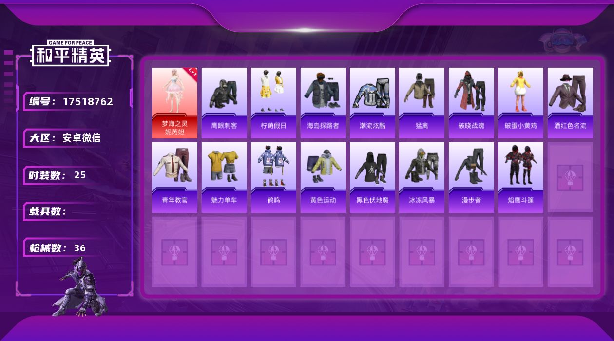 [17518762]安卓 微信-1神装-0粉装-1特效枪-0载具-0粉色飞行器-8502热力值-1王牌印记-25套装-36枪皮【红色神装等级】:梦海之灵-妮芮妲(一级)【红色角色神装】:梦海之灵-妮芮妲【粉色枪皮等级】:Mk14-福马献瑞(四级)【粉色枪皮】:Mk14-福马献瑞