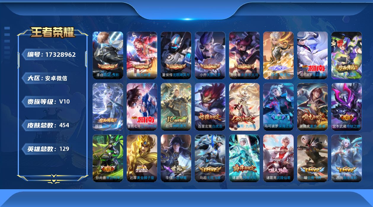 [17328962]安卓WX-V10-至尊星耀IV段位-128英雄-450皮肤-5典藏皮肤-1典藏英雄-1无双-4珍品传说-35传说-135史诗-5星传 【英雄全皮】:刘禅全皮,阿轲全皮,达摩全皮,孙权全皮,钟馗全皮,苍全皮,太乙真人全皮,狂铁全皮,鲁班大师全皮,金蝉全皮,戈娅全皮,空空儿全皮,影全皮 【荣耀典藏】:武则天英雄,夏侯惇无限飓风号,小乔天鹅之梦,孙尚香杀手不太冷,李白鸣剑曳影,瑶拾光映像 【无双皮肤】:曜器灵螭龙剑,韩信群星魔术团 【珍品传说】:马可波罗怪盗基德,鲁班七号江户川柯南,孙策时之奇旅,嫦娥器灵落星盏 【传说皮肤】:后羿神树通天,澜愿照九州拓,云缨幻光神枪,桑启鸣野蒿,艾琳觅芳踪,孙尚香音你闪耀,马可波罗深海之息,后羿无尽星芒,马超无双飞将,大乔挚爱花嫁,孙策挚爱之约,露娜启示之音,裴擒虎寅虎赤拳,赵云淬星耀世,西施游龙清影,李元芳飞鸢探春,诸葛亮时雨天司,虞姬启明星使,曜云鹰飞将,李信一念神魔,刘备时之恋人,貂蝉猫影幻舞,干将莫邪久胜战神,虞姬云霓雀翎,达摩黄金狮子座,百里玄策白虎志,花木兰冠军飞将,梦奇胖达荣荣,诸葛亮武陵仙君,貂蝉仲夏夜之梦,孙尚香末日机甲,宫本武藏地狱之眼,孙悟空地狱火,武则天海洋之心,狄仁杰超时空战士 【限定皮肤】:白起狰,姜子牙天穹之誓,狄仁杰阴阳师,虞姬凯尔特女王,赵云皇家上将,赵云百木心枪,墨子神迹守卫,嬴政优雅恋人,嬴政白昼王子,鲁班七号狮舞东方,庄周高山流水,高渐离死亡摇滚,阿轲迷踪丽影,钟无艳超时空战士,孙膑妖精王,扁鹊炼金王,白起夜都怪侠,芈月重明,芈月幻夜卜梦,吕布猎兽之王,周瑜赤莲之焰,元歌云间偶戏,元歌无心,夏侯惇朔风刀,夏侯惇匿光决锋者,甄姬游园惊梦,甄姬落雪兰心,曹操烛龙,典韦蓝屏警告,马可波罗暗影游猎,马可波罗深海之息,狄仁杰魔术师,狄仁杰万华元夜,达摩星际陆战队,达摩沙漠行僧,项羽海滩派对,项羽霸王别姬,老夫子醍醐杖,老夫子航海奇遇记,关羽冰锋战神,程咬金演武夺筹,露娜启示之音,刘邦夺宝奇兵,王昭君凤凰于飞,王昭君午后时光,兰陵王驯魔猎人,兰陵王金庭之子,亚瑟潮玩骑士王,牛魔御旌,后羿圣弓游侠,后羿无尽星芒,李元芳银河之约,李元芳云中旅人,虞姬霸王别姬,虞姬启明星使,钟馗神迹守卫,钟馗驱傩正仪,杨玉环遇见飞天,女娲朔望之晖,干将莫邪真爱魔法,雅典娜单词大作战,雅典娜黎明之约,蔡文姬繁星吟游,太乙真人饕餮,太