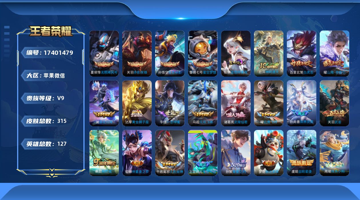 [17401479]苹果WX-V9-最强王者段位-127英雄-315皮肤-4典藏皮肤-18传说-99史诗-1星传
