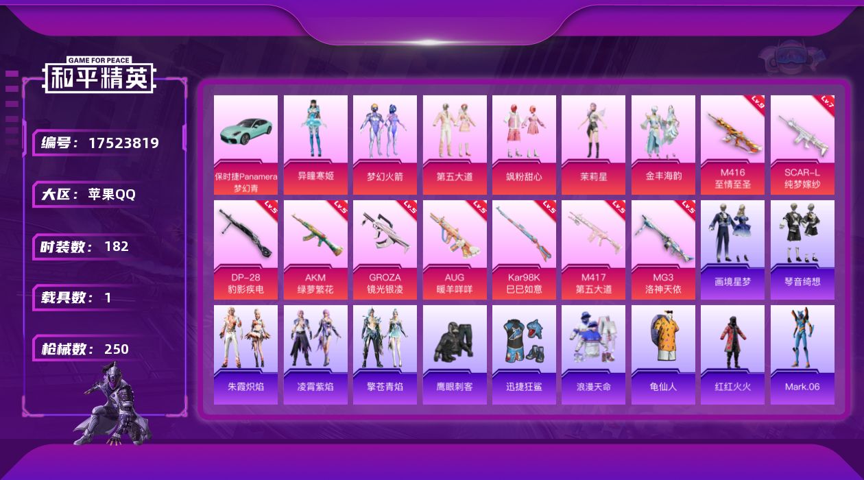 [17523819]苹果 手Q-6粉装-12特效枪-1载具-3粉色飞行器-73440热力值-16王牌印记-182套装-250枪皮 【热门品类】:粉装-梦幻火箭,套装-浪漫天命,套装-龟仙人,套装-红红火火,角色-Mark.06 【粉色套装】:粉装-梦幻火箭,粉装-第五大道,粉装-飒粉甜心,角色-茉莉星,粉装-金丰海韵,角色-异瞳寒姬 【粉色枪皮等级】:AKM-绿萝繁花(五级),SCAR-L-纯梦嫁纱(七级),M416-至情至圣(九级),GROZA-镜光银凌(五级),AUG-暖羊咩咩(五级),UMP45-萌骑冒险(五级),AKS-74U-森灵之息(五级),Kar98K-巳巳如意(五级),Mk14-福马献瑞(三级),M417-第五大道(五级),DP-28-豹影疾电(五级),MG3-洛神天依(五级) 【粉色载具】:保时捷Panamera(梦幻青) 【粉色枪皮】:AKM-绿萝繁花,SCAR-L-纯梦嫁纱,M416-至情至圣,GROZA-镜光银凌,AUG-暖羊咩咩,UMP45-萌骑冒险,AKS-74U-森灵之息,Kar98K-巳巳如意,Mk14-福马献瑞,M417-第五大道,DP-28-豹影疾电,MG3-洛神天依 【粉色飞行器】:炫彩糖果飞行器,拂晓神骑飞行器 【粉色降落伞】:绝对恒星降落伞,幻影战神降落伞,梦幻火箭降落伞,洛神天依降落伞,暗星紫秘降落伞,暗夜鎏金降落伞,海螺星光降落伞,第五大道降落伞,仲夏莫吉托降落伞,圣堂之誓降落伞,江南烟雨降落伞,异瞳寒姬降落伞,炫彩糖果降落伞 【稀有套装】:套装-龟仙人,套装-巳巳如意,套装-炫彩糖果,套装-马上来财,套装-糖糖葫芦,套装-青团波波,套装-燕燕于飞,套装-鱼渊荷华,角色-风玲,套装-紫幽梦,套装-蓝冰羽,套装-云朵鹅,套装-雪绒豹,角色-绛羽幽主,套装-朱霞炽焰,套装-凌霄紫焰,套装-擎苍青焰,套装-画境星梦,套装-琴音绮想,套装-雨过天青,套装-红釉青花 【稀有枪皮】:AKM-彩虹符号,AKM-破晓战魂,AKM-胡桃卫兵,AKM-龙的传人,M16A4-幻世战舞者,M16A4-甜心亚梦,M16A4-红色方程式,M16A4-蓝色火焰,SCAR-L-夜灯,SCAR-L-炫彩节奏,SCAR-L-玉兔迎春,SCAR-L-红色方程式,M416-糯团青竹,M416-红色方程式,M416-蓝色火焰,GROZA-2B战斗服款,GROZA-异彩先驱,GRO