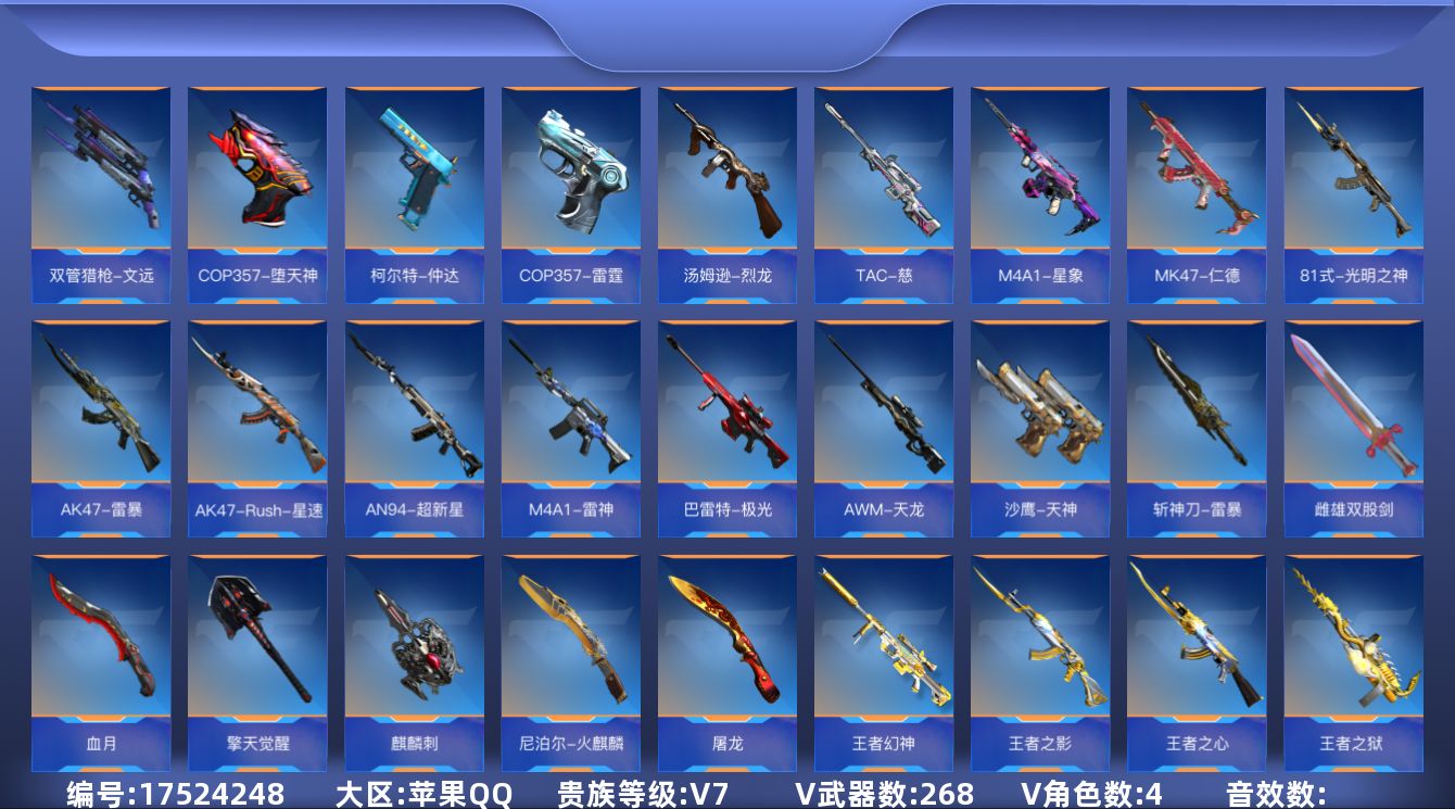 [17524248]【店主推荐捡漏号!可直接换绑】19英雄角色数-268英雄武器数- 【王者系列】:王者之刺,王者之击,王者之影,王者之心,王者之蝶,王者之狱,王者之魂,王者幻神,王者之霆,巴雷特-雷霆王者 【热门武器】:81式-光明之神*2,MK47-仁德,M4A1-星象,M4A1-游骑兵,TAC-慈,COP 357-雷霆,COP 357-堕天神,81式-阿波罗,CZS2-仲康,COP 357-安琪拉,AN94-盖 【角色】:萝拉,关小雨*2,零-新生,步练师 【英雄武器】:AK47-Rush-星速*2,AK47-雷暴*2,M4A1-雷神,M4A1-游骑兵,M4A1-星象,AN94-超新星,AN94-盖,81式-光明之神*2,MK47-仁德,AWM-天龙,巴雷特-极光*3,巴雷特-雷霆王者,TAC-慈,TAC-雷暴,汤姆逊-烈龙,CZS2-仲康,M12S-天公,沙鹰-天神*2,COP 357-雷霆,COP 357-堕天神,COP 357-安琪拉,双管猎枪-文远,柯尔特-仲达,雌雄双股剑,气勇胆烈戟,屠龙*5,尼泊尔-火麒麟,血月,麒麟刺,擎天觉醒,斩神刀-雷暴