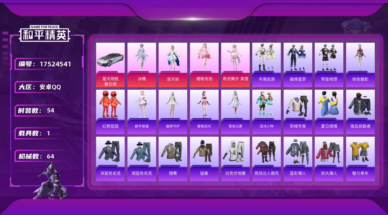 [17524541]安卓 手Q-6粉装-3特效枪-1载具-1粉色飞行器-20418热力值-3王牌印记-54套装-64枪皮