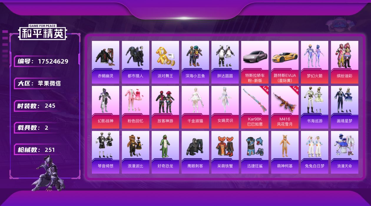 [17524629]苹果 微信-无敌战神框-7粉装-2特效枪-2载具-0粉色飞行器-84835热力值-15王牌印记-245套装-251枪皮