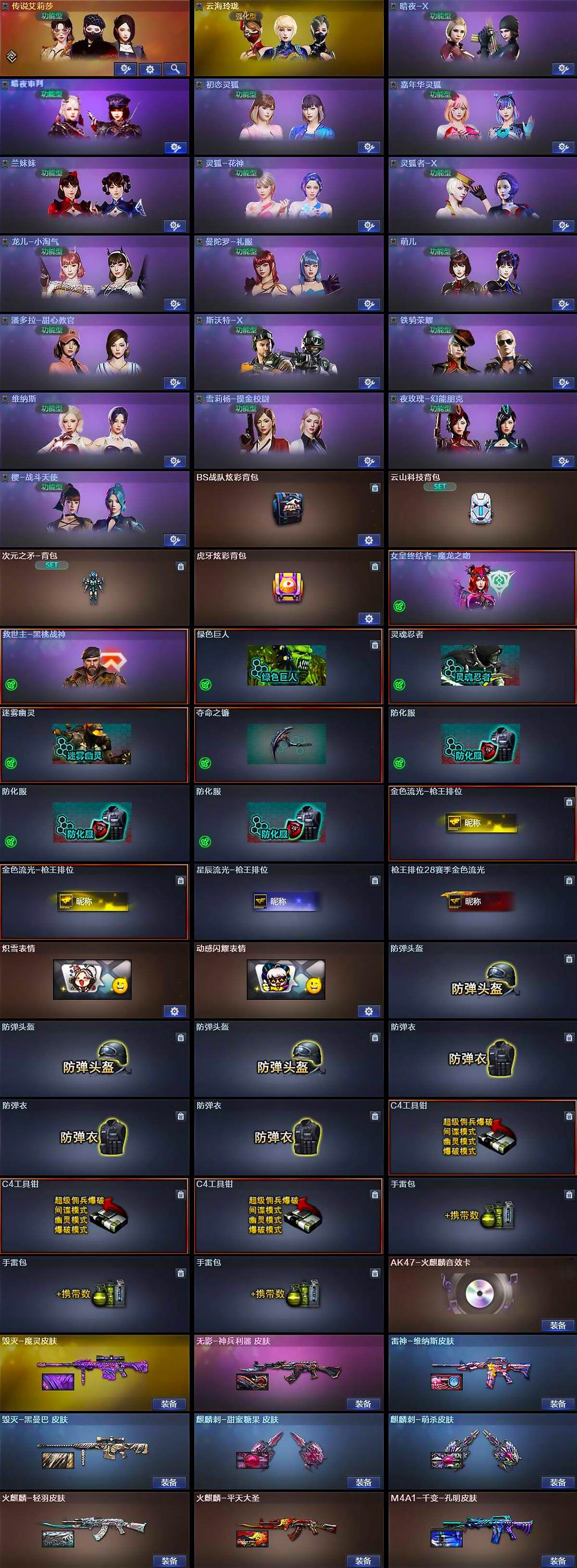 【道具】:BS战队炫彩背包,云山科技背包,次元之矛-背包,虎牙炫彩背包,女皇终结者-魔龙之吻,救世主-黑桃战神,绿色巨人,灵魂忍者,迷雾幽灵,夺命之镰,防化服*3,金色流光-枪王排位*2,星辰流光-枪王排位,枪王排位28赛季金色流光,炽雪表情,动感闪耀表情,防弹头盔*3,防弹衣*3,C4工具钳*3,手雷包*3