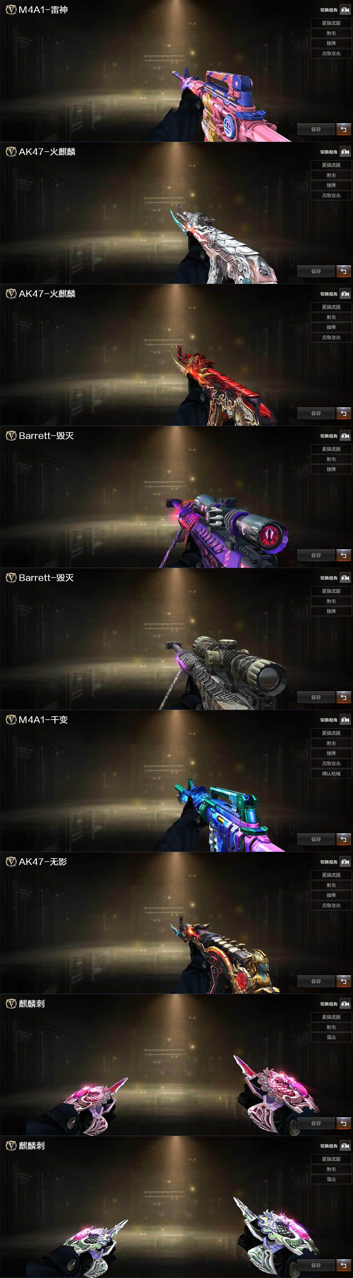 【英雄级武器】:AK47-火麒麟,M4A1-雷神,AK47-机械迷城,M4A1-神工天巧,无影-神兵利器,王者之势-觉醒版,QBZ-03-王者蔷薇-觉醒版,白虎之魄-觉醒版,机械迷城-穹宇,Barrett-毁灭,Kar98K-星神,USP-神工天巧,麒麟刺,唐刀-神工天巧,高爆手雷-神工天巧,闪光弹-神工天巧,烟雾弹-神工天巧,M4A1-赤狱骑士
